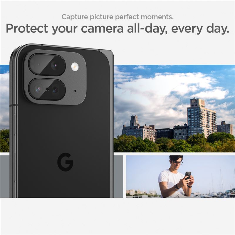 Sada dvou ochranných skel Spigen Glass tR EZ Fit Optik dodává potřebnou bezpečnost specifickému fotomodulu ohebného telefonu Google Pixel 9 Pro Fold. Materiál s vysokou odolností 9H chrání čočky před prasknutím i oděrkami při odkládání zařízení na různé povrchy.