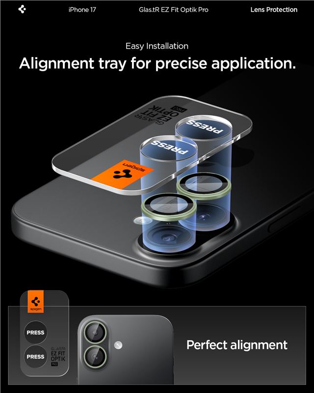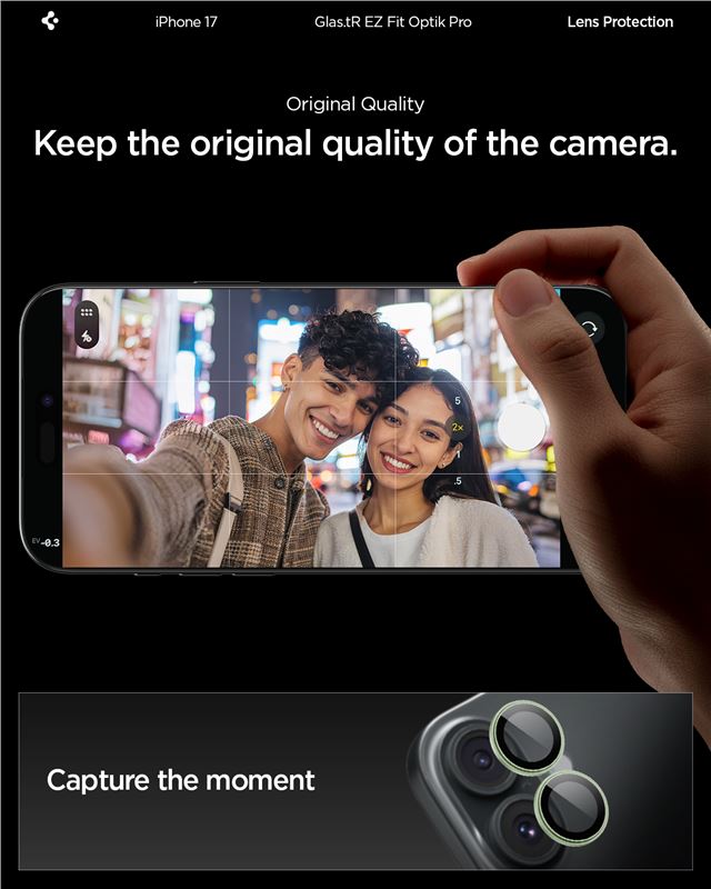 Sada dvou kusů tvrzeného skla Spigen Glass tR EZ Fit Optik Pro v zeleném odstínu efektivně brání poškození fotoaparátu u iPhone 17. S tvrdostí 9H tvoří odolný štít proti nárazům i jemnému poškrábání, které by mohlo zhoršit kvalitu fotografií.