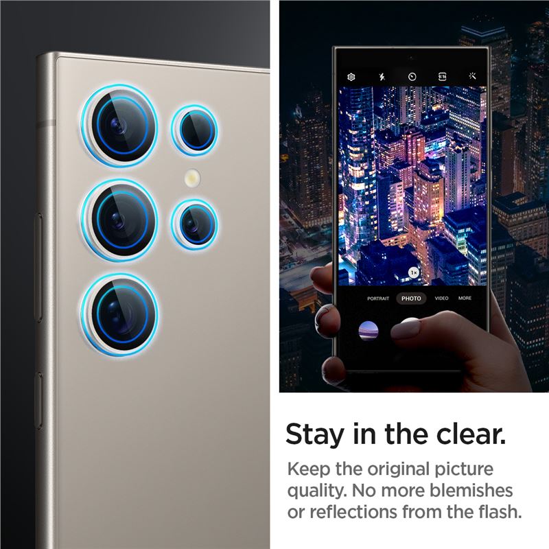 Sada dvou kusů tvrzeného skla Spigen Glass tR EZ Fit Optik Pro v šedé barvě poskytuje dedikovanou ochranu jednotlivým čočkám fotoaparátu na Samsung Galaxy S24 Ultra. Transparentní sklo s tvrdostí 9H zachovává špičkovou kvalitu obrazu a zároveň chrání před rozbitím.