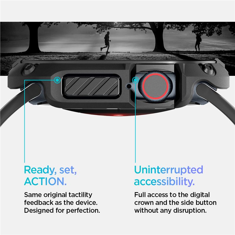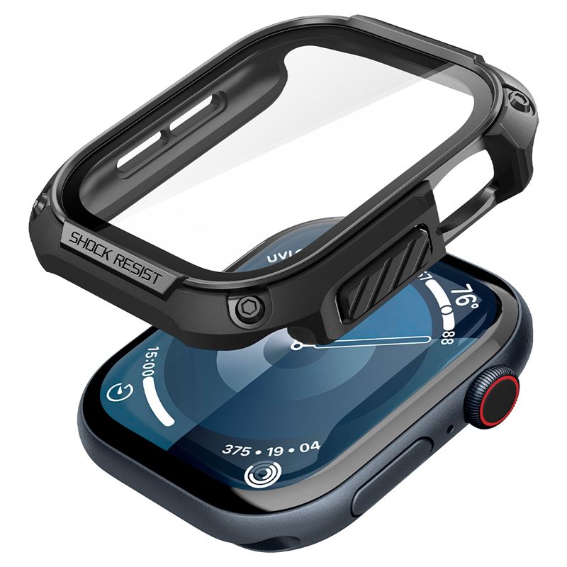 Využívá zvýšené okraje pro eliminaci rizika rozbití obrazovky při pádu a přesné výřezy umožňují pohodlné ovládání digitální korunky i bočních tlačítek. Odolná konstrukce splňuje náročné standardy a zachovává elegantní vzhled chytrých hodinek.
