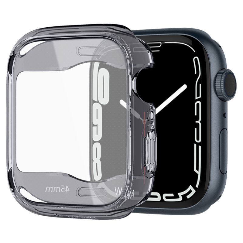 Ochranný kryt pro Apple Watch 9, 8 a 7 (45 mm) v transparentní šedé barvě zajišťuje komplexní ochranu obrazovky i bočních hran. Pružná vrstva z nárazuvzdorného TPU materiálu tlumí údery a tvarově přizpůsobený design zachovává původní vzhled i kompaktní rozměry chytrých hodinek.