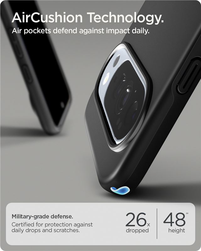 Odolává nárazům pomocí technologie Air Cushion a chrání displej i čočky fotoaparátu vyvýšenými hranami. Přesné výřezy zaručují plnou funkčnost všech portů a senzorů bez omezení uživatelského komfortu.