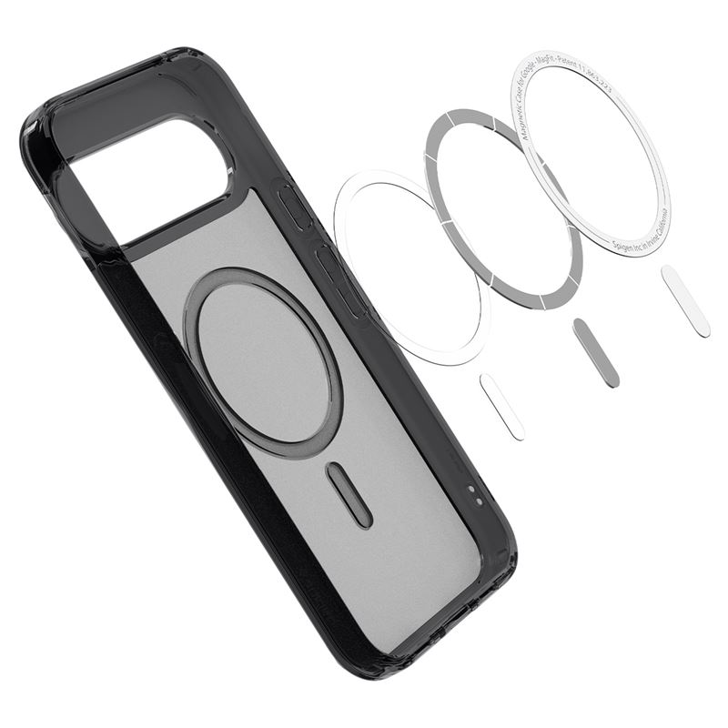 Transparentní černý kryt Spigen Ultra Hybrid MagSafe přesně doplňuje Google Pixel 10 Pro XL. Magnetický kruh v zadní části zajišťuje pevné spojení s MagSafe příslušenstvím a podporuje plynulé bezdrátové nabíjení.