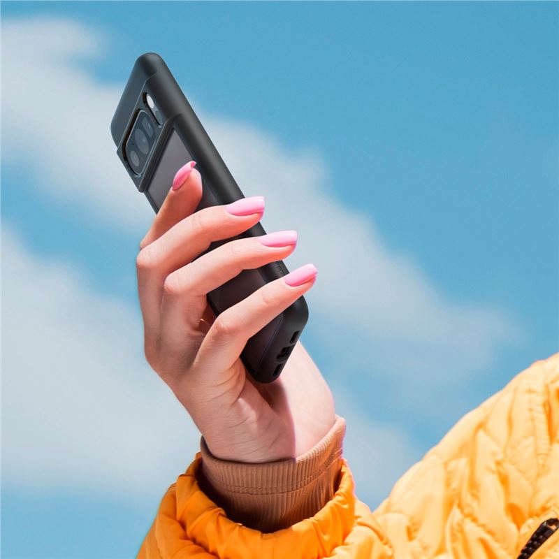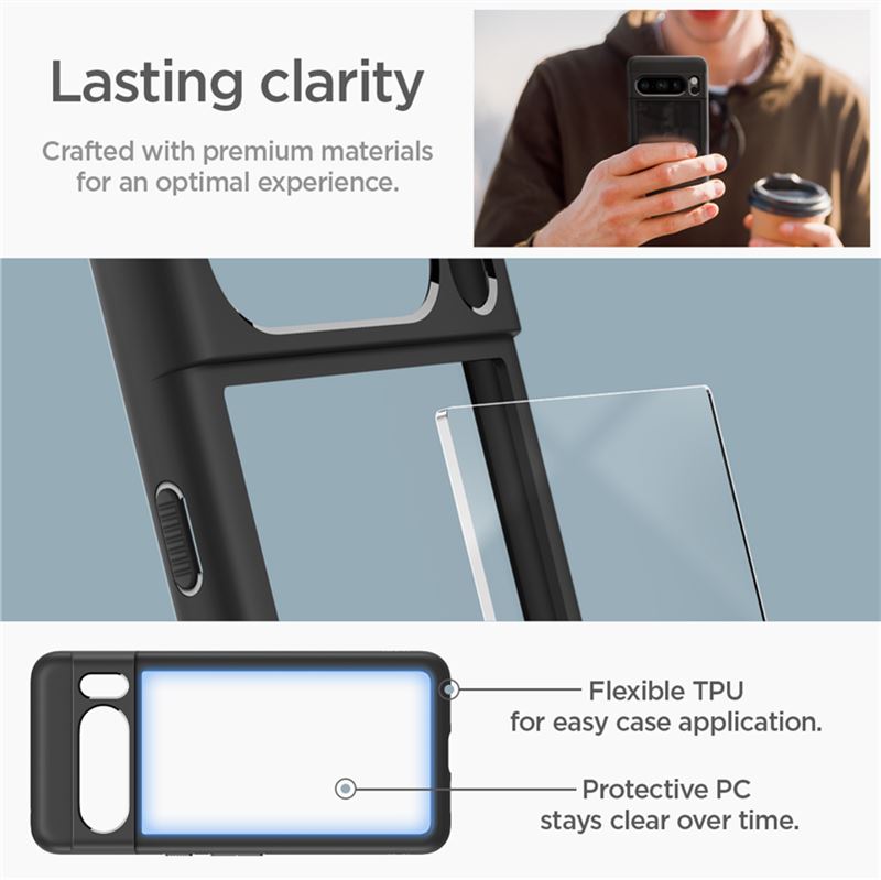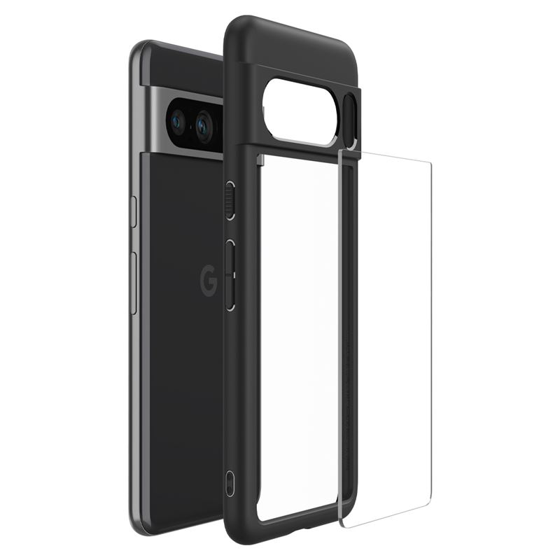 Spigen Ultra Hybrid v matně černém provedení spojuje pevnou polykarbonátovou zadní část s pružným TPU rámečkem. Hybridní konstrukce přesně kopíruje linie telefonu Google Pixel 8 Pro a zajišťuje mu vysokou odolnost proti poškrábání i nárazům. Zvýšené okraje kolem displeje a čočky fotoaparátu brání přímému kontaktu s rovným povrchem, čímž eliminují riziko mechanického poškození.