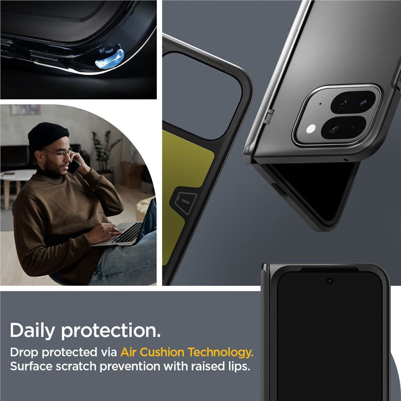 Ochranný kryt pro Google Pixel 9 Pro Fold využívá pokročilou dvouvrstvou technologii pro maximální absorpci nárazů. Pevná kombinace TPU a polykarbonátu obepíná celé tělo telefonu včetně jeho pantu a zajišťuje vysokou mechanickou odolnost proti poškození.