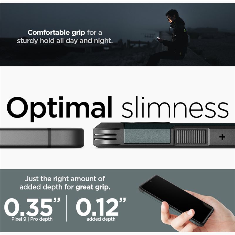 Zelený ochranný kryt Spigen Tough Armor kombinuje absorbující TPU s pevným polykarbonátem pro ochranu Google Pixelu 9 nebo 9 Pro. Hybridní dvouvrstvé provedení vytváří odolný štít proti mechanickému poškození a splňuje náročné bezpečnostní standardy pro každodenní intenzivní používání.
