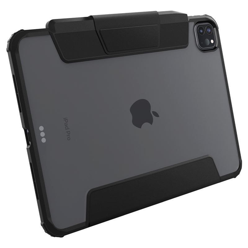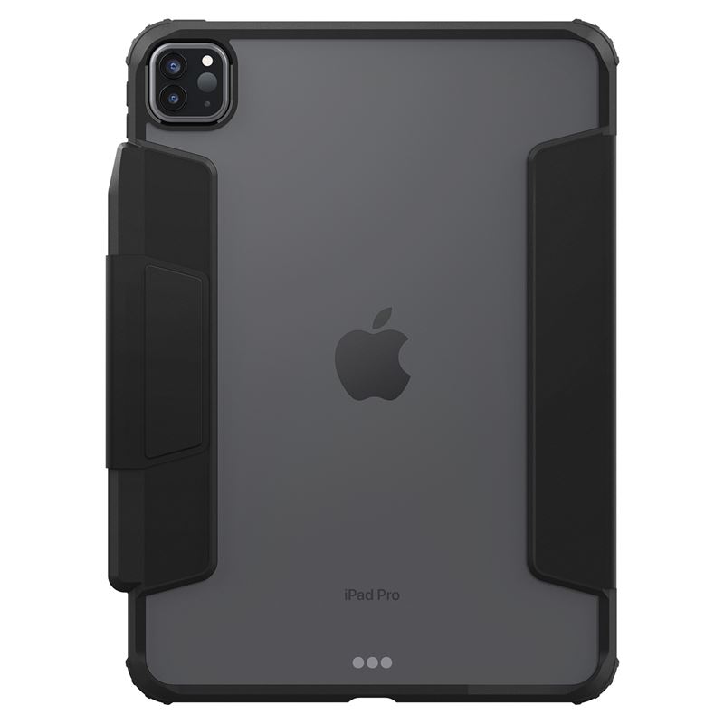 Stylové černé pouzdro pro iPad Pro 11" (2024) poskytuje dvouvrstvou ochranu složenou z TPU a polykarbonátu. Přední chlopeň umožňuje složení do stabilního stojánku pro pohodlné psaní nebo sledování obsahu, zatímco zadní průhledná část dává vyniknout designu tabletu.