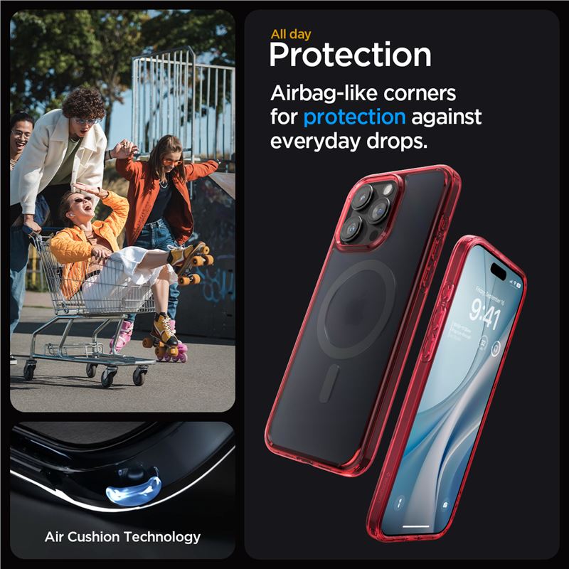 Transparentní červený kryt Spigen Ultra Hybrid MagSafe pro iPhone 15 Pro Max spojuje odolnost hybridní konstrukce s plnou podporou ekosystému MagSafe. Pevná záda a pružný obvodový rám zajišťují bezpečný úchop i snadnou instalaci na telefon.