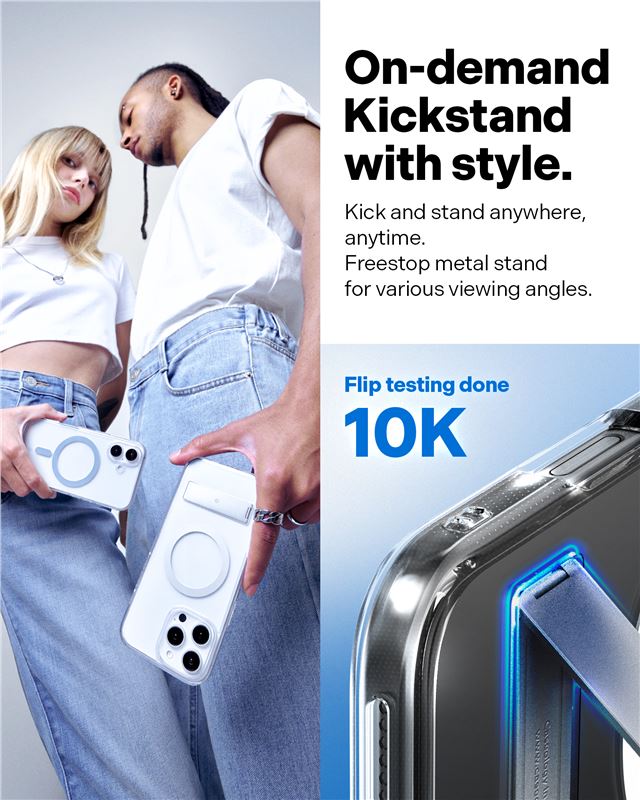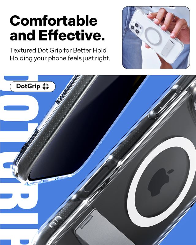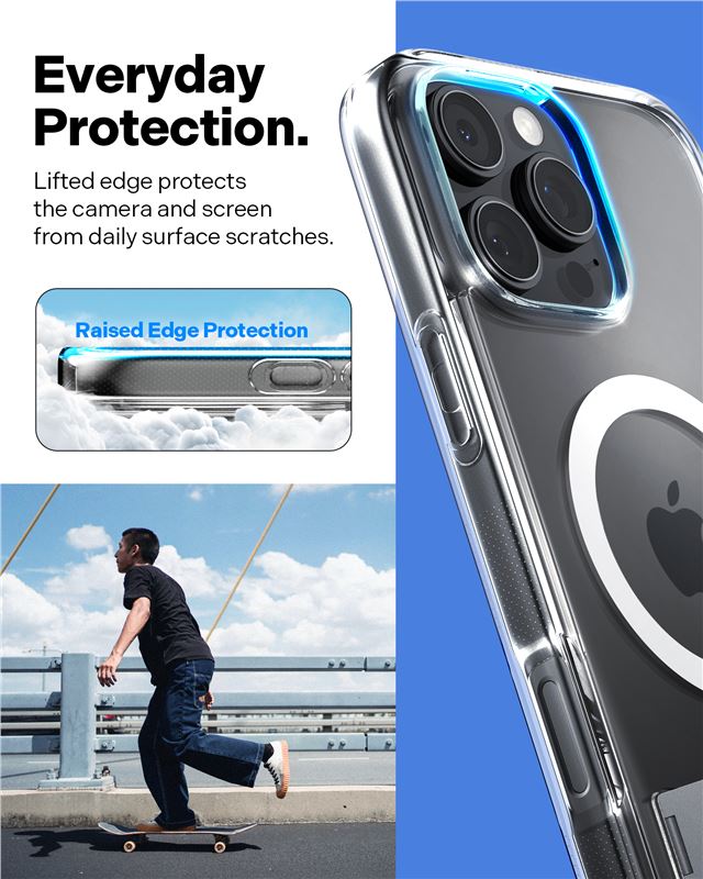 Využívá vyvýšené okraje pro ochranu čoček fotoaparátu a displeje, přičemž disponuje certifikací military grade pro spolehlivé pohlcování pádů. Vestavěná funkce Kickstand usnadňuje sledování videí v optimálním úhlu a neomezuje funkčnost bezdrátových nabíječek.