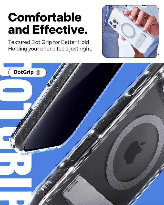 Využívá vyvýšené okraje pro ochranu čoček fotoaparátu a displeje, přičemž disponuje certifikací military grade pro spolehlivé pohlcování pádů. Vestavěná funkce Kickstand usnadňuje sledování videí v optimálním úhlu a neomezuje funkčnost bezdrátových nabíječek.