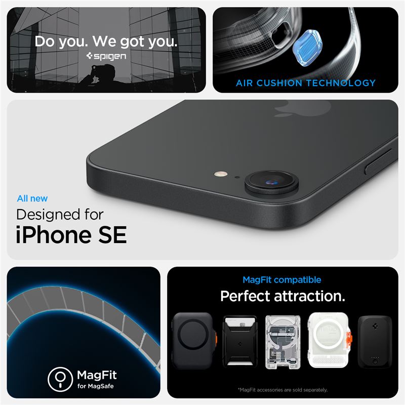 Uchovává telefon v bezpečí skrze technologii Air Cushion a mírně vyvýšené hrany, které chrání displej i čočku fotoaparátu před přímým kontaktem s podložkou. Přesné výřezy jsou navrženy tak, aby nijak neomezovaly funkčnost senzorů ani ovládacích tlačítek.