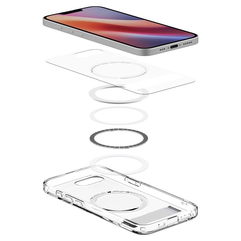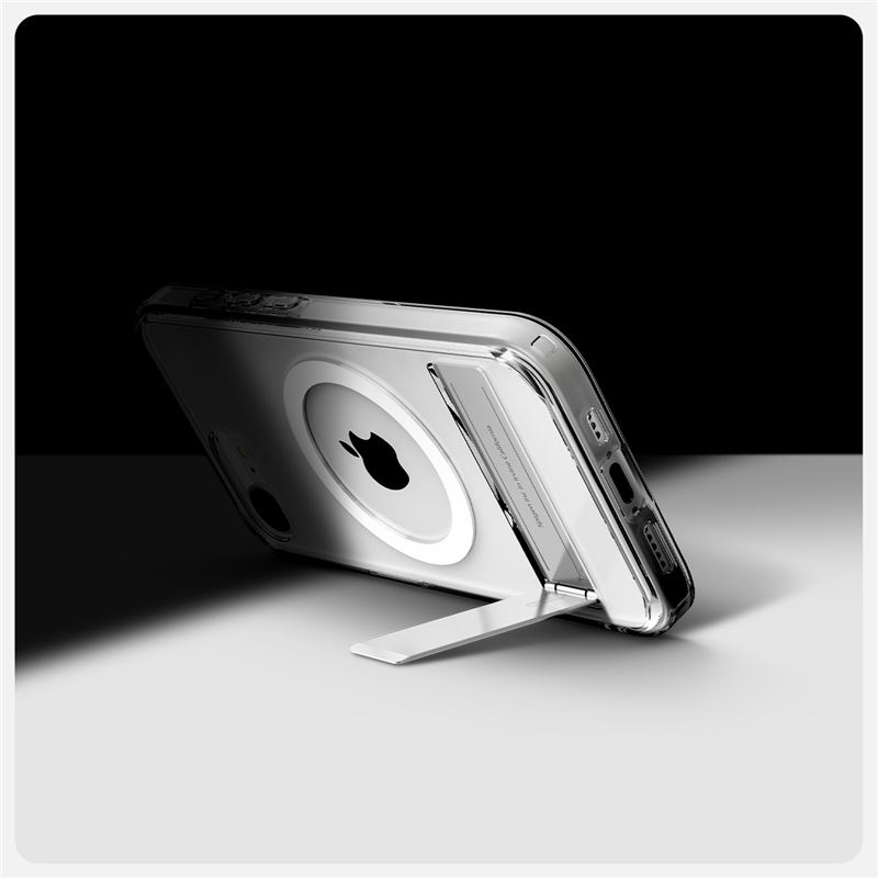 Hybridní kryt pro iPhone 16e v transparentním bílém provedení obsahuje integrovaný magnetický kruh pro bleskové připojení MagSafe doplňků. Praktický výklopný stojánek na zadní straně dovoluje pohodlné sledování obsahu v optimálním pozorovacím úhlu.