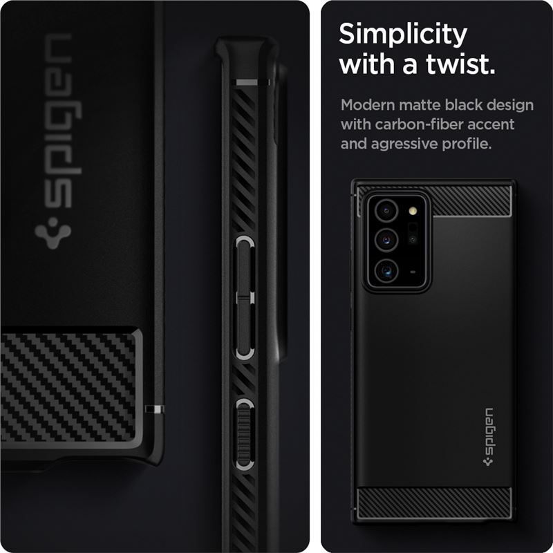 Prémiový ochranný kryt Spigen Rugged Armor pro Samsung Galaxy Note20 Ultra přináší kombinaci matné černé barvy a sportovních karbonových prvků. Odolný TPU materiál zajišťuje spolehlivé tlumení nárazů a zároveň zachovává elegantní siluetu telefonu.