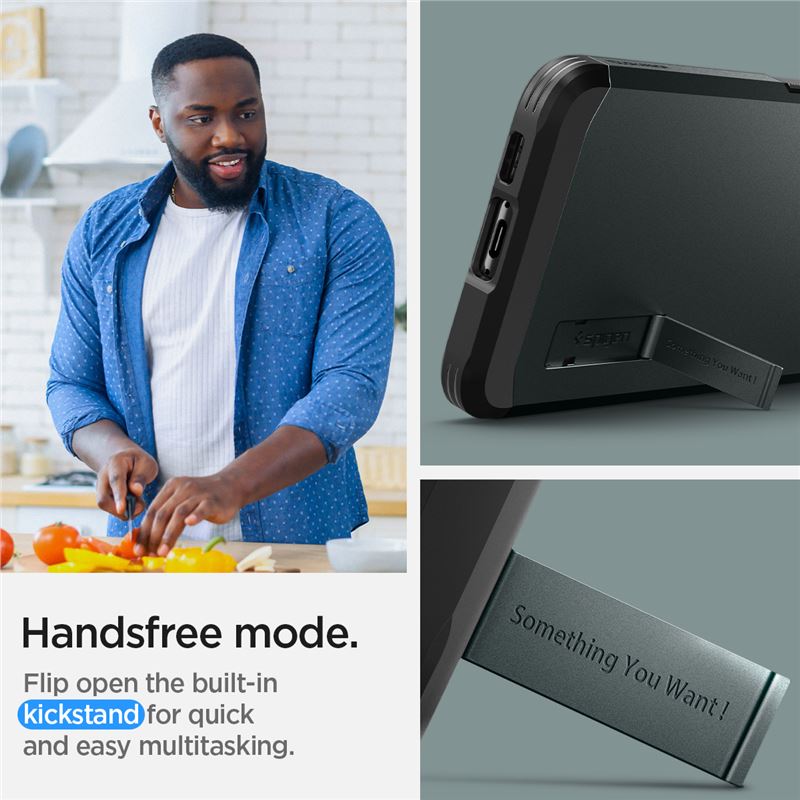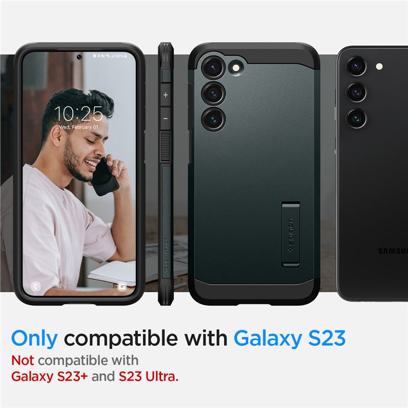 Robustní ochranný kryt Spigen Tough Armor pro Samsung Galaxy S23 v zelené barvě splňuje přísné vojenské certifikace odolnosti. Pevný polykarbonátový plášť spojený s vnitřní vložkou z TPU vytváří bariéru proti mechanickému poškození, škrábancům i usazování nečistot.