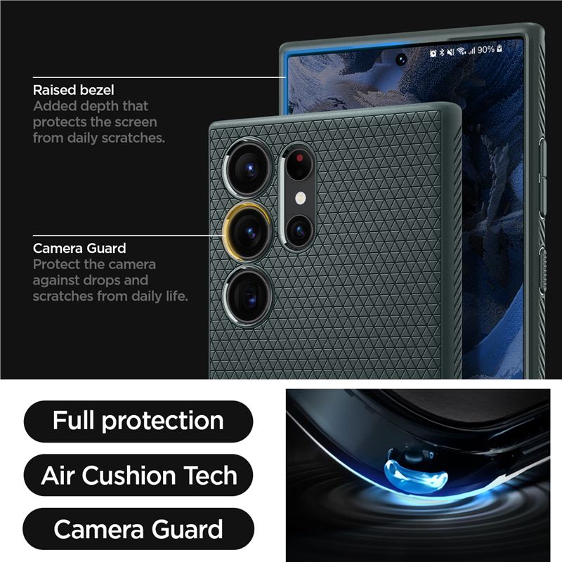 Odolává nárazům a otřesům využitím integrované technologie Air Cushion v kritických částech pouzdra. Mírně vyvýšené okraje poskytují nezbytnou ochranu pro pokročilou optiku fotoaparátu i velký displej před poškrábáním na hladkém povrchu.