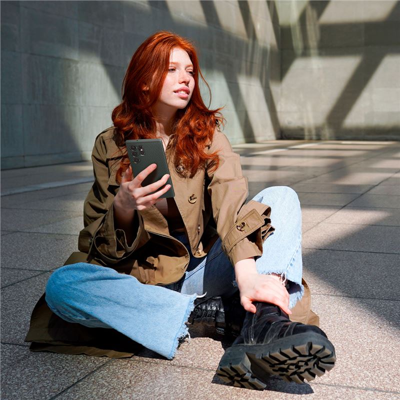 Zelený kryt pro Samsung Galaxy S23 Ultra s charakteristickým vzorem přináší moderní vzhled spojený s vysokou odolností. Matný povrch zajišťuje stabilitu při manipulaci s tímto rozměrným chytrým telefonem a je příjemný na dotek.
