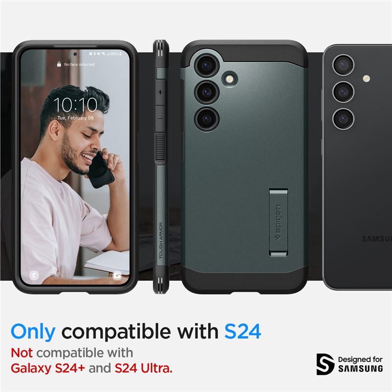 Dvouvrstvý kryt Spigen Tough Armor v zeleném provedení zajišťuje pro Samsung Galaxy S24 špičkové zabezpečení v minimalistickém designu. Spojení vnitřní vrstvy z TPU a vnější polykarbonátové skořepiny vytváří pevnou ochranu, která odolá i náročným pádům na tvrdý povrch.