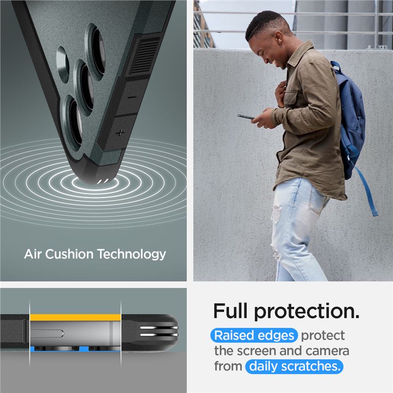 Využívá technologii Air Cushion v rozích pro pohlcení nárazů a zvýšené okraje k eliminaci poškrábání displeje i optiky fotoaparátu. Přesné výřezy zachovávají plný přístup ke všem portům, přičemž materiál nebrání pohodlnému bezdrátovému nabíjení.