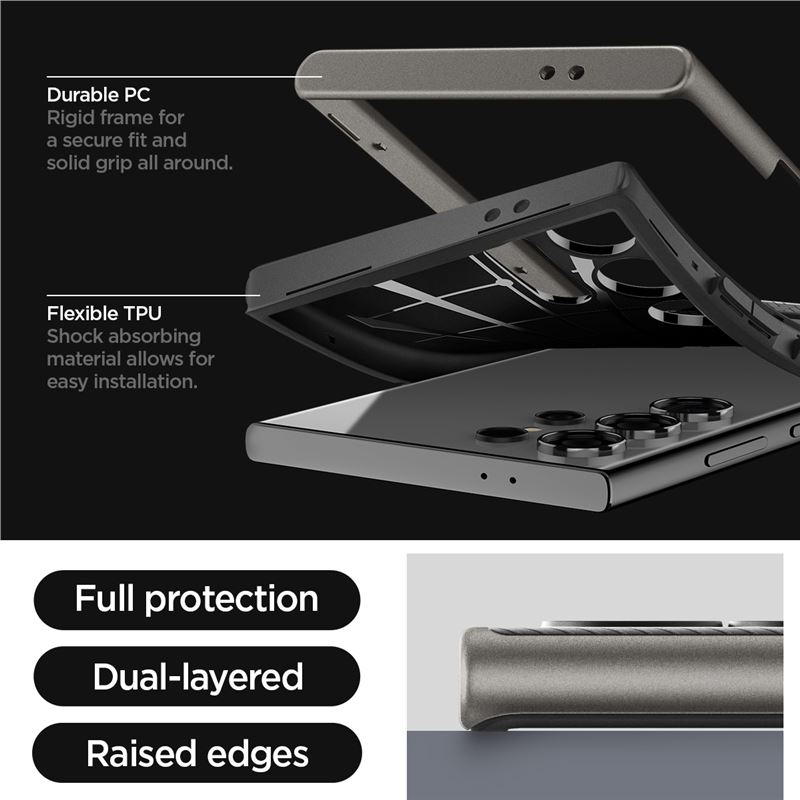 Ochranný kryt v šedém provedení kombinuje dvě vrstvy materiálů pro dosažení špičkové bezpečnosti telefonu Samsung Galaxy S24 Ultra. Spojení pružného TPU a pevného polykarbonátového rámu vytváří robustní bariéru, která efektivně rozkládá energii nárazu při nechtěném pádu.