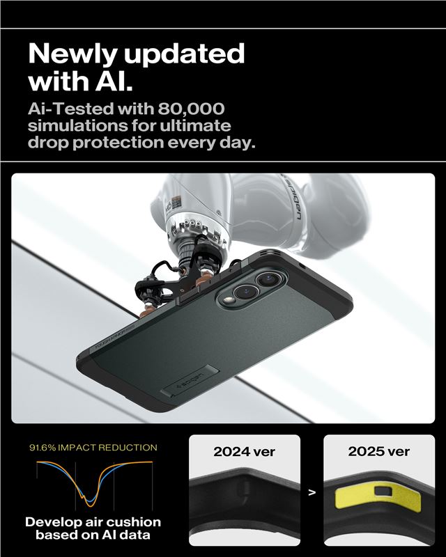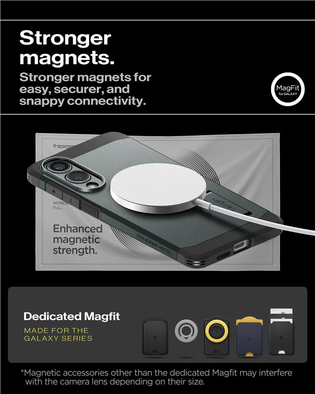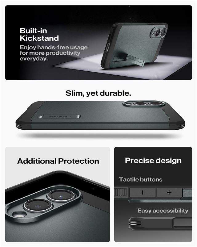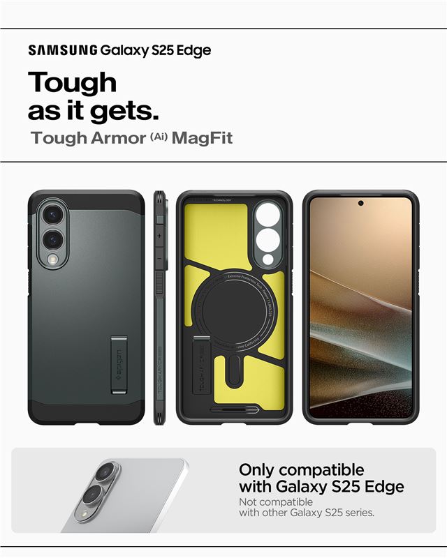 Odolné pouzdro Spigen Tough Armor MagSafe v zeleném provedení zajišťuje pro Samsung Galaxy S25 Edge špičkové zabezpečení. Dvouvrstvá ochrana z TPU a polykarbonátu absorbuje otřesy a vyhovuje přísným vojenským normám. Magnetický prstenec integrovaný v těle dovoluje plné využití MagSafe ekosystému a rychlého nabíjení.