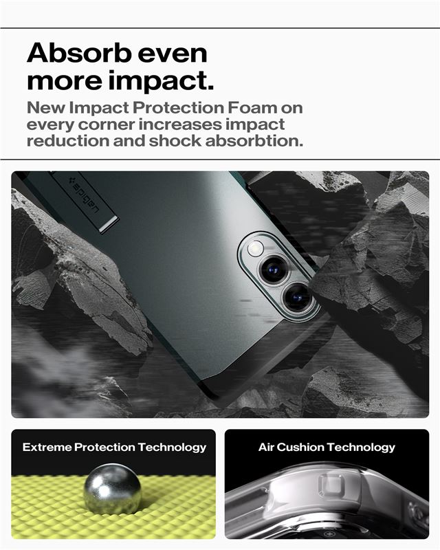 Zabraňuje poškození hran a displeje využitím mírně zvýšeného profilu a technologie Air Cushion v rozích. Praktický stojánek usnadňuje sledování videí v horizontální poloze a přesné výřezy zajišťují plynulé ovládání všech funkcí.