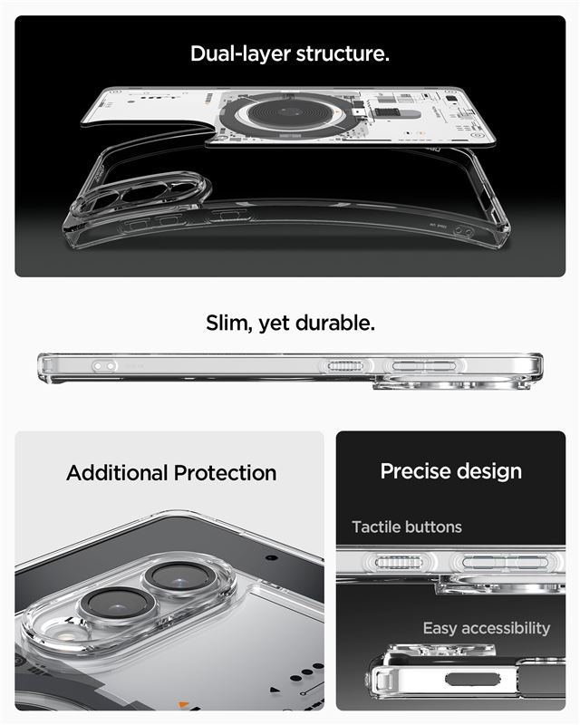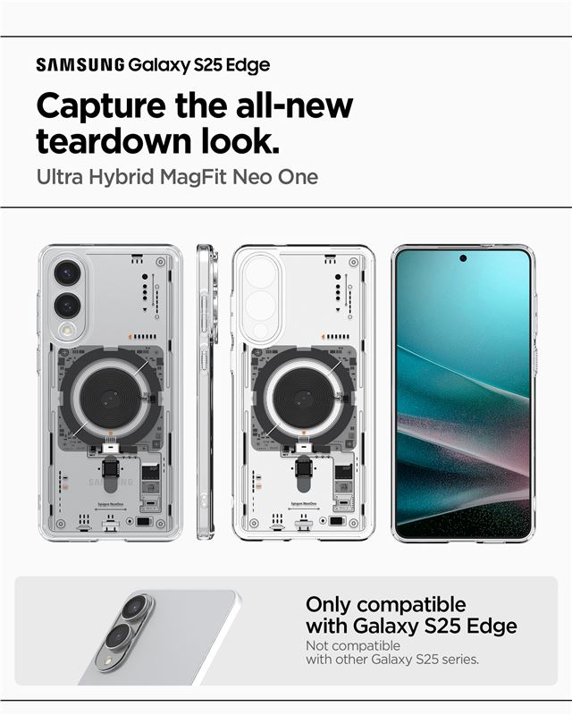 Ochranný kryt Spigen Ultra Hybrid MagSafe v transparentním provedení pro Samsung Galaxy S25 Edge spojuje pevná záda s ohebným obvodovým rámem. Zabudovaný magnetický kruh umožňuje stabilní spojení s nabíječkami a držáky MagSafe, čímž rozšiřuje funkčnost bez nutnosti sundávat obal.