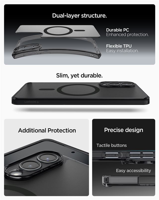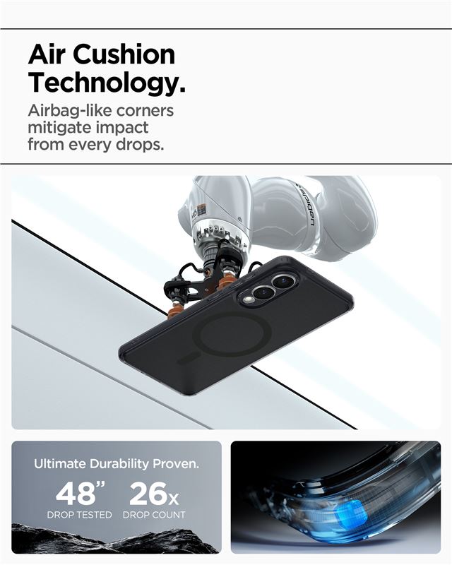 Odolává pádům pomocí technologie Air Cushion v každém rohu a splňuje přísnou certifikaci Mil-grade. Promyšleně zvýšené okraje chrání zakřivený displej i čočky kamer před přímým nárazem na rovný povrch, zatímco přesné otvory zajišťují přirozené ovládání a snadný přístup ke všem funkcím.