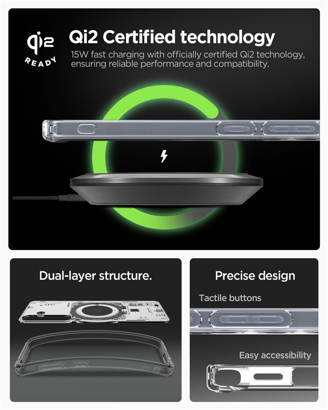 Chrání telefon před poškozením pomocí certifikované technologie Air Cushion v rozích, která pohlcuje nárazy při pádech. Mírně vystouplé okraje brání poškrábání displeje i čoček fotoaparátu při položení na rovný povrch, zatímco přesné výřezy zachovávají okamžitý přístup ke všem ovládacím prvkům.