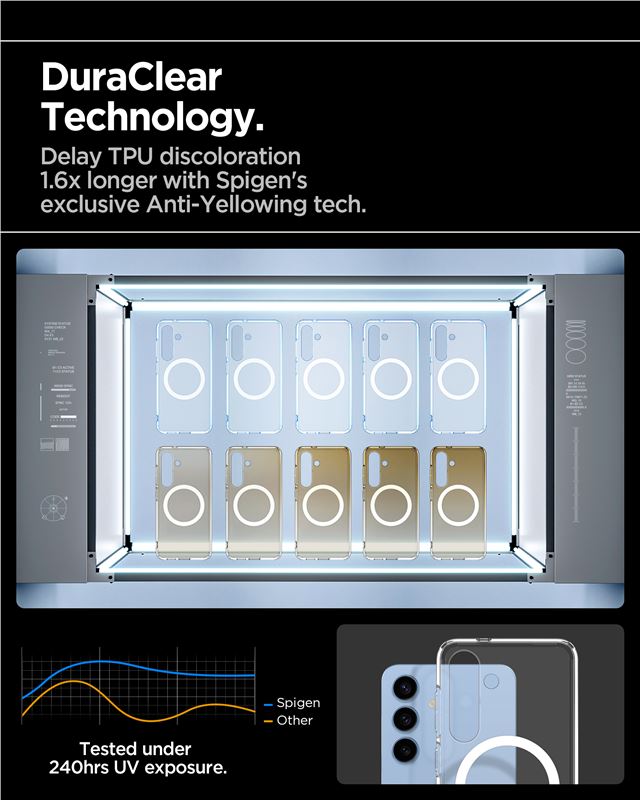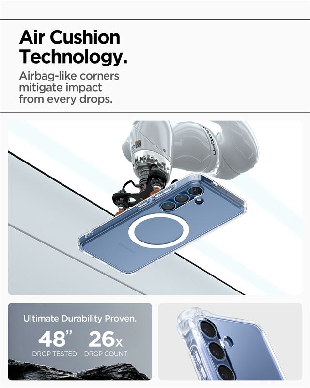 Zabraňuje poškození telefonu při nehodě použitím technologie Air Cushion v každém rohu a splňuje náročné armádní normy odolnosti. Zvýšený okraj kolem displeje i fotoaparátu snižuje riziko vzniku rýh a škrábanců při pokládání zařízení na tvrdý povrch.