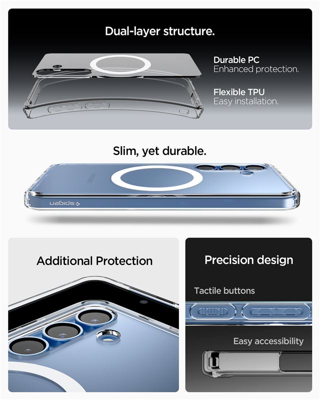 Chrání telefon před poškozením při pádu využitím technologie Air Cushion v každém rohu a splňuje přísnou vojenskou certifikaci odolnosti. Zvýšený okraj efektivně izoluje displej i čočku fotoaparátu od rovného povrchu, zatímco přesný výřez zachovává okamžitý přístup ke každé funkci zařízení.