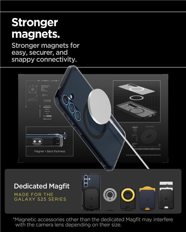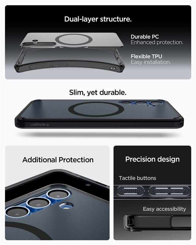 Ochranný kryt Spigen Ultra Hybrid MagSafe v transparentně černé barvě podtrhuje linie Samsung Galaxy S25 a tvoří pevný štít proti škrábancům i nárazům. Konstrukce z TPU a polykarbonátu zajišťuje odolnost při každodenním používání. Magnetický kroužek uvnitř pouzdra dovoluje okamžité a pevné spojení s nabíječkami i držáky standardu MagSafe.