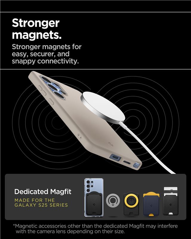 Integrovaný magnet rozšiřuje funkčnost o MagSafe ekosystém, což umožňuje bleskové přichycení magnetických doplňků. Zvýšený profil kolem displeje a zadních kamer zabraňuje poškození při pokládání na stůl a přesné výřezy zachovávají snadný přístup k peru S Pen.