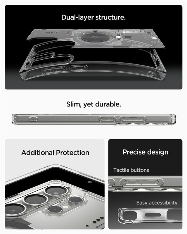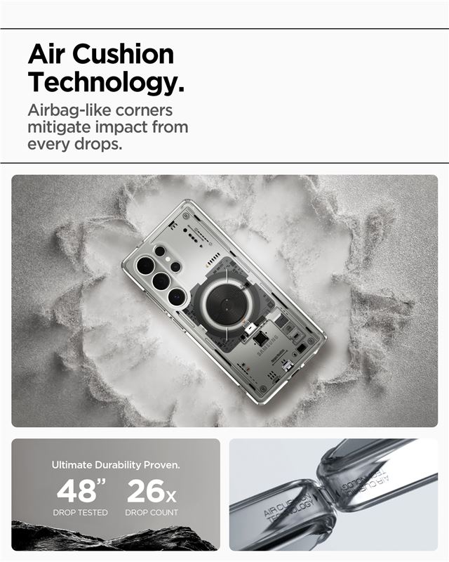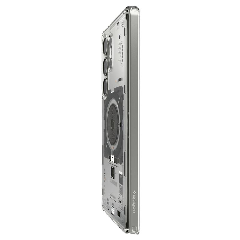 Průhledný kryt Spigen Ultra Hybrid MagSafe pro Samsung Galaxy S25 Ultra zajišťuje vyváženou ochranu hybridní konstrukcí z polykarbonátu a TPU. Silný magnetický prstenec integrovaný v zadní části umožňuje bezchybnou spolupráci s bezkontaktním nabíjením MagSafe i dalším magnetickým příslušenstvím.