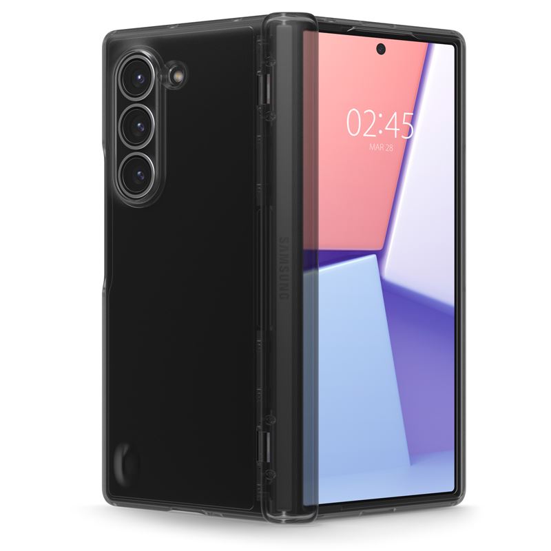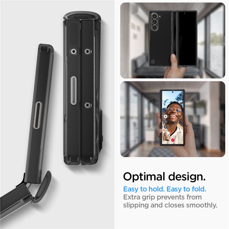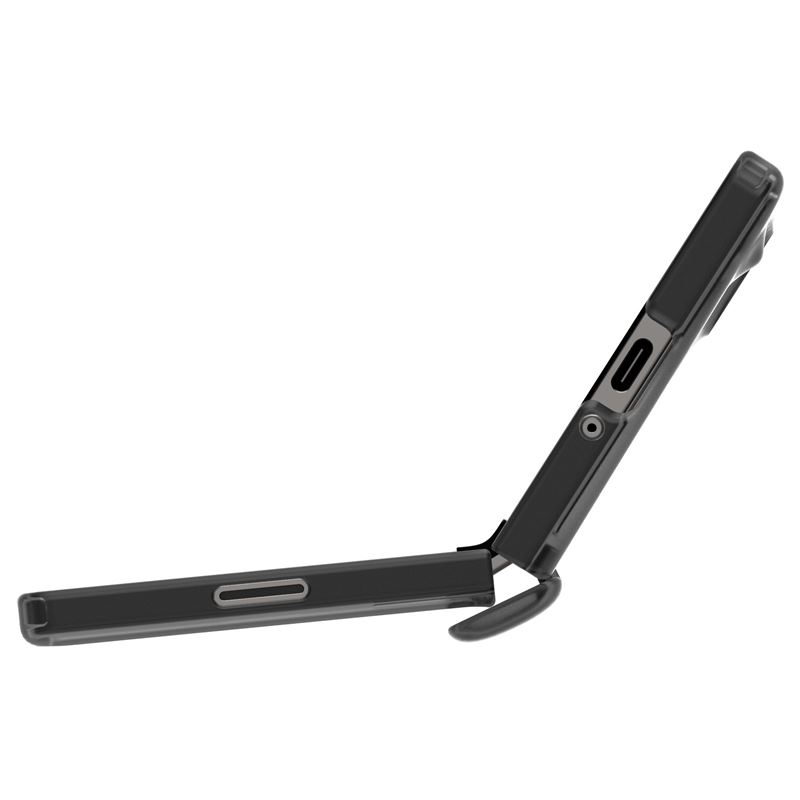 Transparentní šedý kryt respektuje specifickou konstrukci skládacího telefonu. Hybridní složení z odolného polykarbonátu a ohebného TPU rámečku poskytuje pevnou oporu celému tělu přístroje, přičemž přesně umístěné výřezy zaručují volný přístup ke všem portům i kamerám.