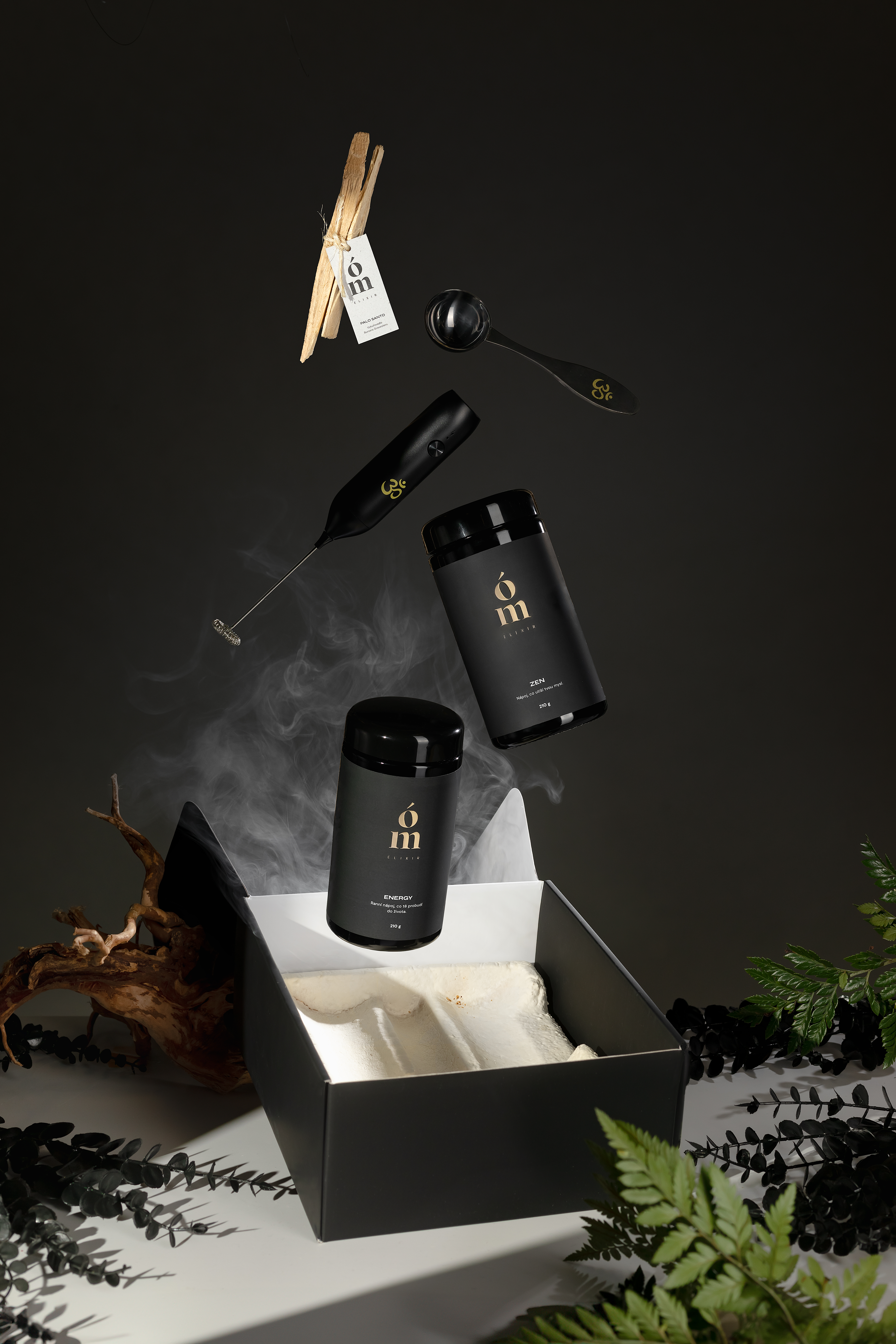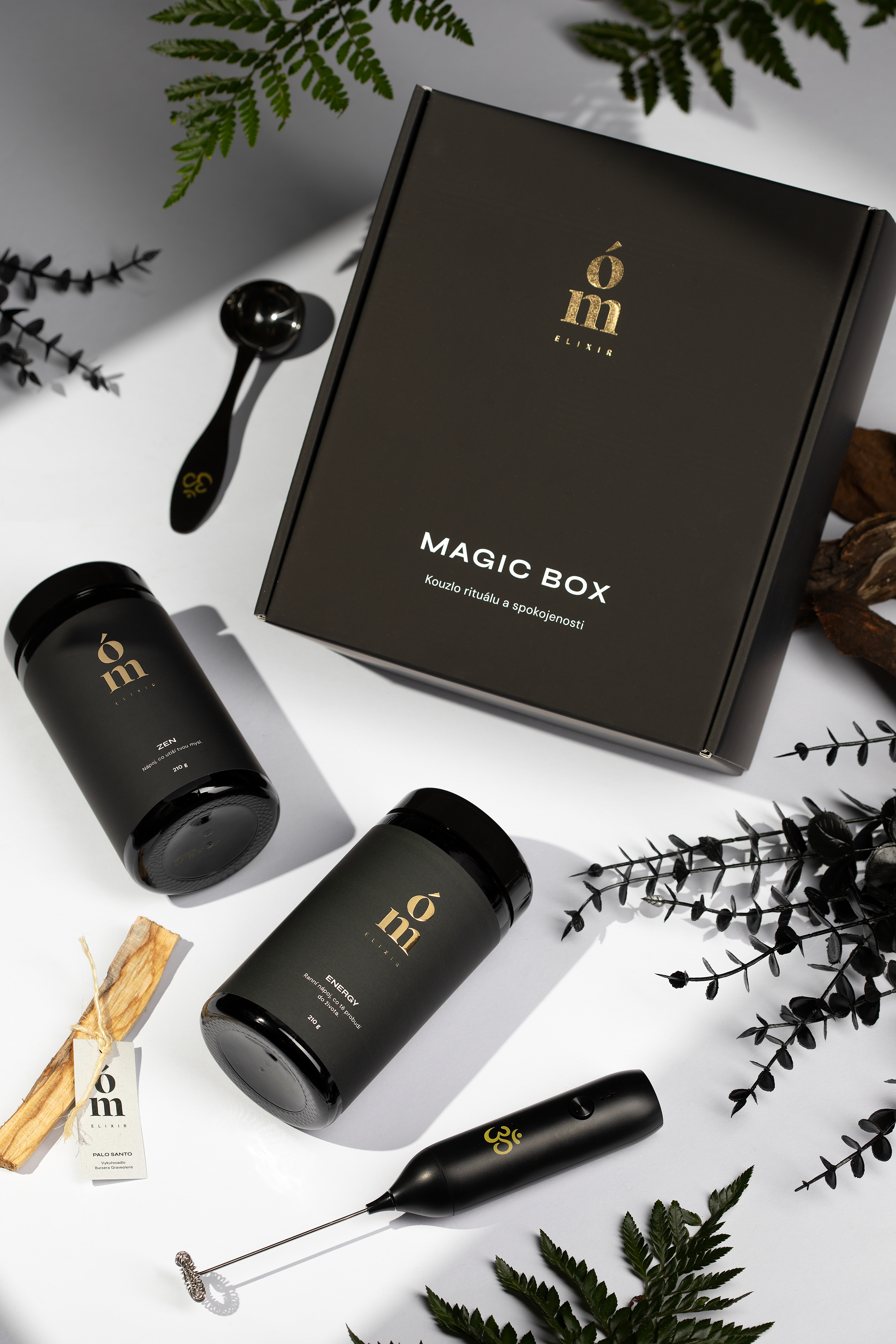 Obsah boxu: Set obsahuje: Ómelixir® ENERGY, Ómelixir® ZEN, ruční mixér, odměrku pro snadné dávkování a Palo Santo pro očistu prostoru.
