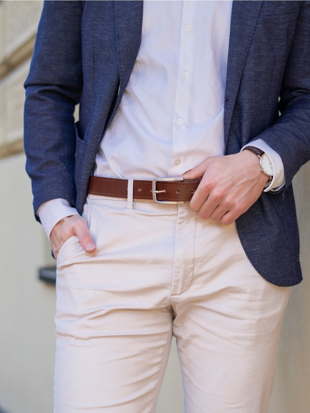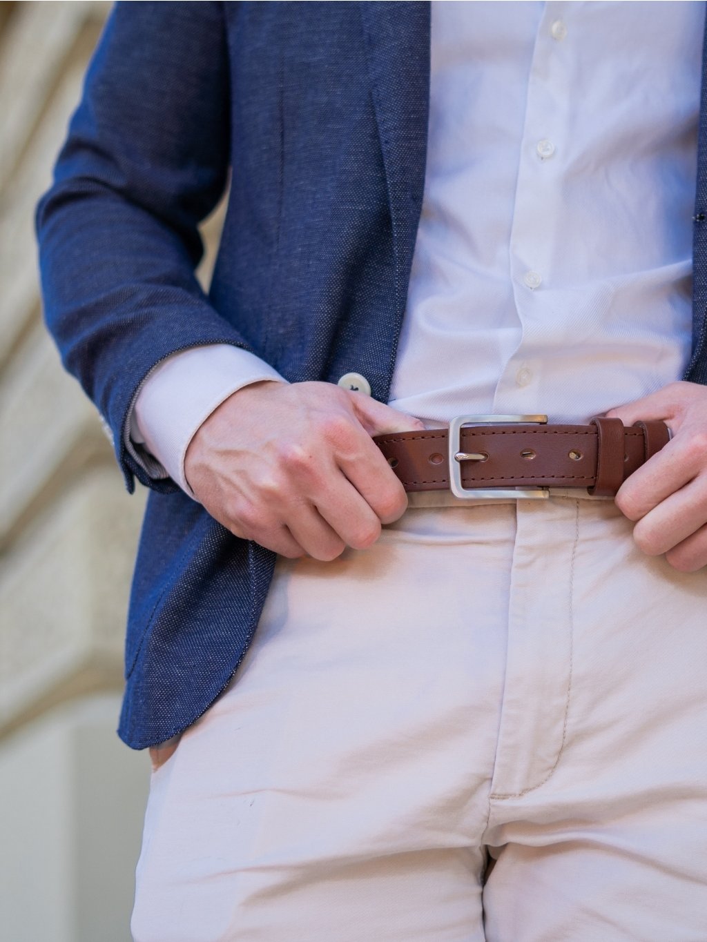 Pánský kožený opasek do kalhot prošívaný. Tento kožený pánský opasek jsme vyladili do detailu a vydrží vám fakt dlouhé roky. Opasek je vyroben ze silné hověziny s pečlivě zabroušenými hranami, což zaručuje jeho pohodlí a komfort při nošení. Díky těmto kvalitním materiálům opasek netlačí a je ideální volbou pro každodenní použití. Přezky z nerezové oceli či mosazi zaručují dlouhou životnost a odolnost. Pro cenově dostupnější variantu jsou k dispozici i přezky ze zinkoslitiny. Tyto nerozbitné přezky jsou navrženy tak, aby odolaly všem výzvám, které jim každodenní nošení přinese. Délka opasku je upravena přesně na míru vašemu pasu, nebo je k dispozici v nejčastější velikosti, pokud nejste si jistí přesným obvodem. Barevné prošití nejen zpevňuje celý opasek, ale také mu dodává elegantní a designový vzhled. Decentní ražba umožňuje přidání monogramu nebo i celého jména podle vašeho přání, což z něj činí skvělý osobní dárek. Každý opasek je vybaven dvěma koženými průvlečkami, které drží volný konec pevně na svém místě, a tak zabraňují jeho pohybu. Tento detail zajišťuje, že opasek bude vypadat upraveně za všech okolností.