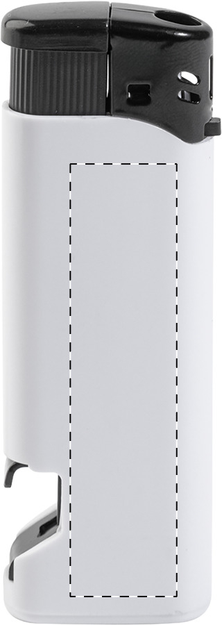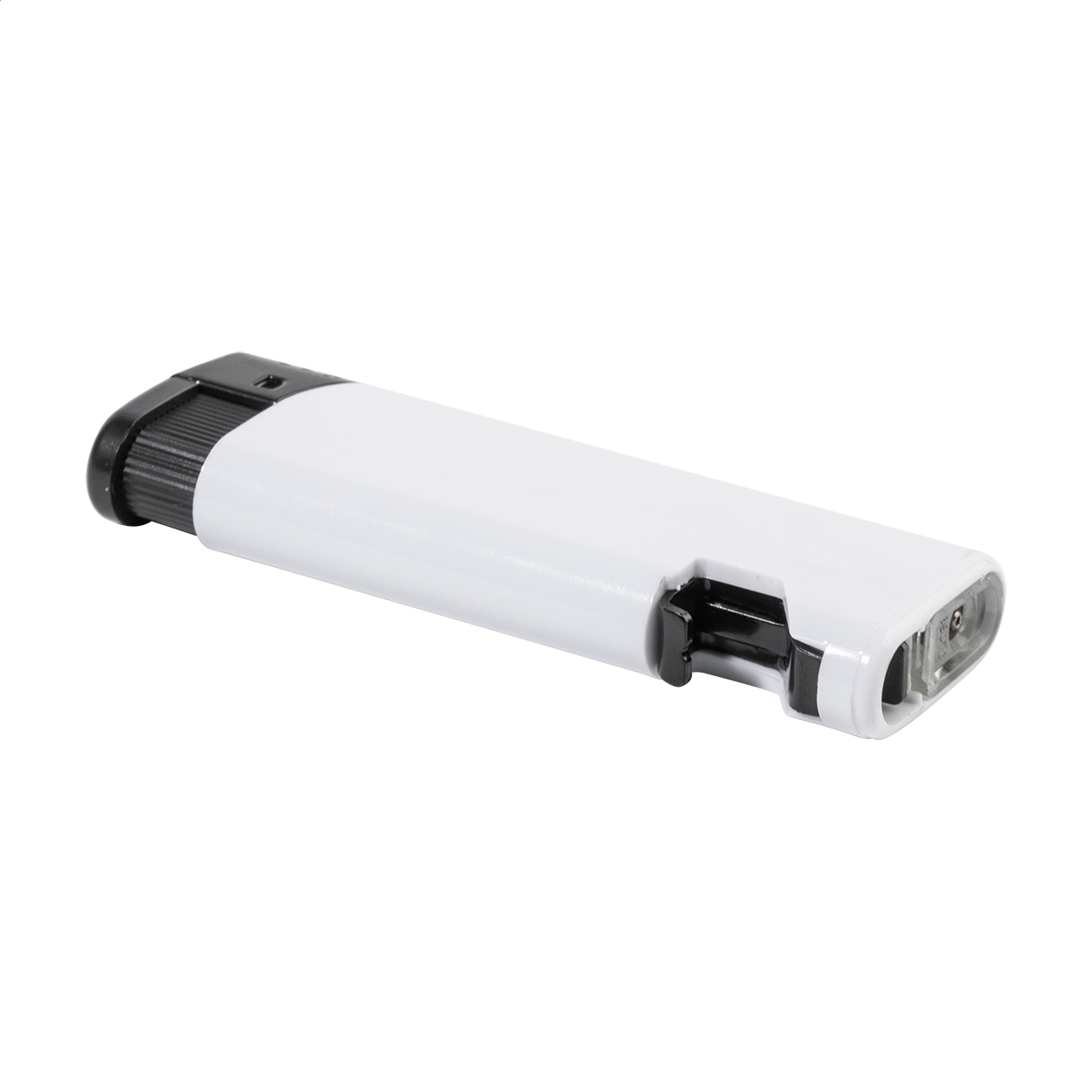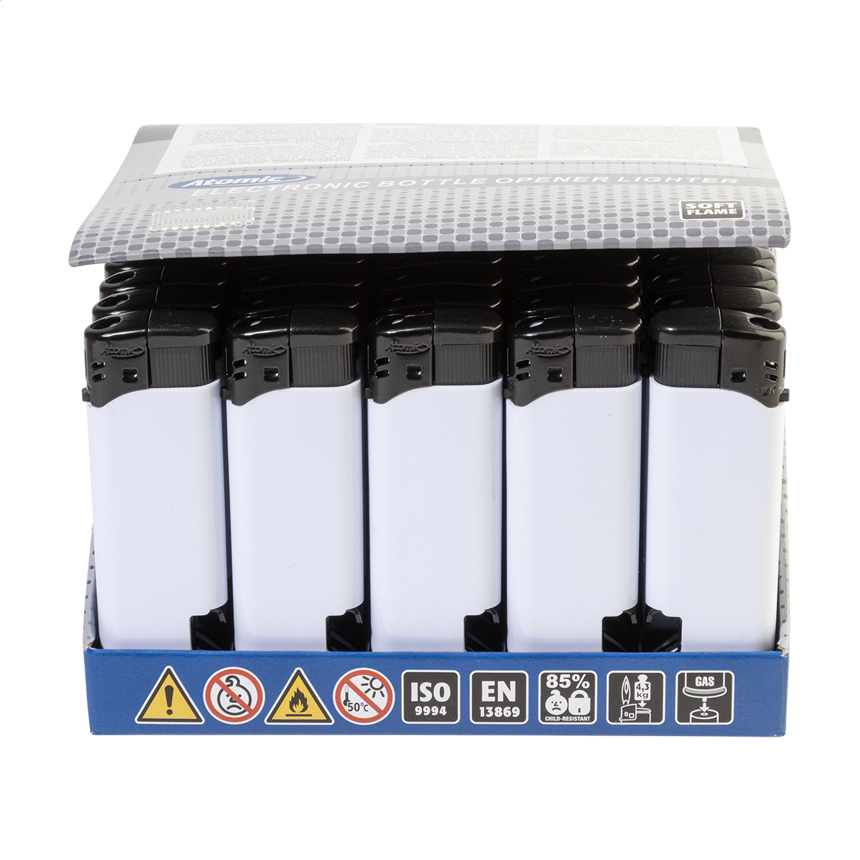Plnitelný plastový piezoelektrický zapalovač s otvírákem. Dětská pojistka. Dodává se s přibližně 80% hladinou plynu. K dispozici pouze v plném exportním kartonovém množství (násobky 500 kusů)!
