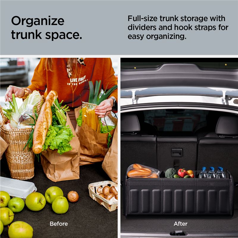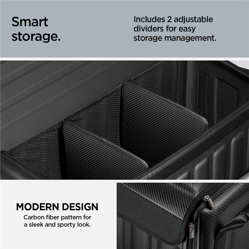 Odolný organizér Spigen vnáší přehledný systém do zavazadlového prostoru vozů Tesla. Přesné tvarování zajišťuje okamžitou a stabilní instalaci, která pevně drží na svém místě i při dynamické jízdě v zatáčkách.