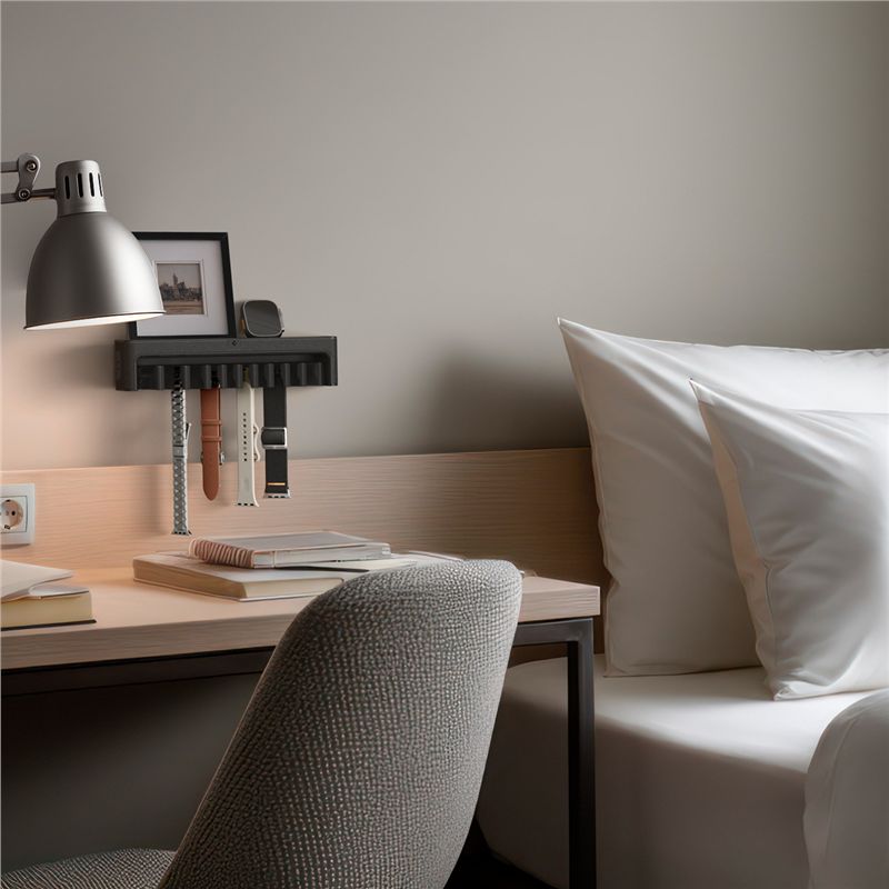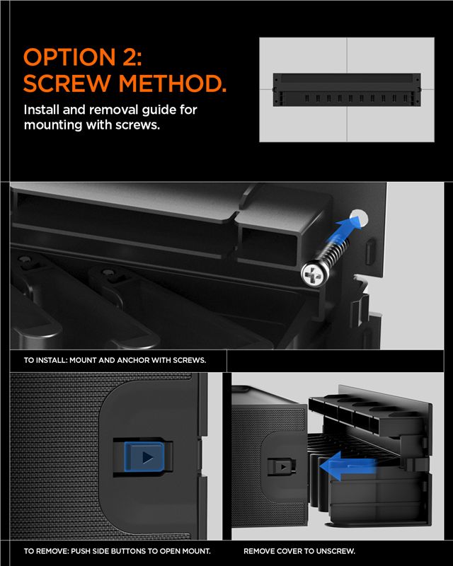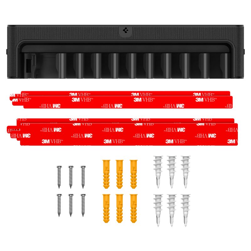 Umožňuje flexibilní montáž na stěnu pomocí silné oboustranné lepicí pásky nebo pevným přišroubováním s využitím přiložených hmoždinek. Čistý černý design sjednocuje vzhled příslušenství a zrychluje výběr vhodného doplňku pro aktuální příležitost.