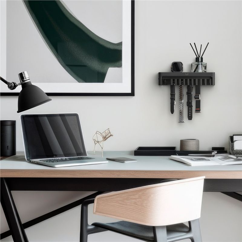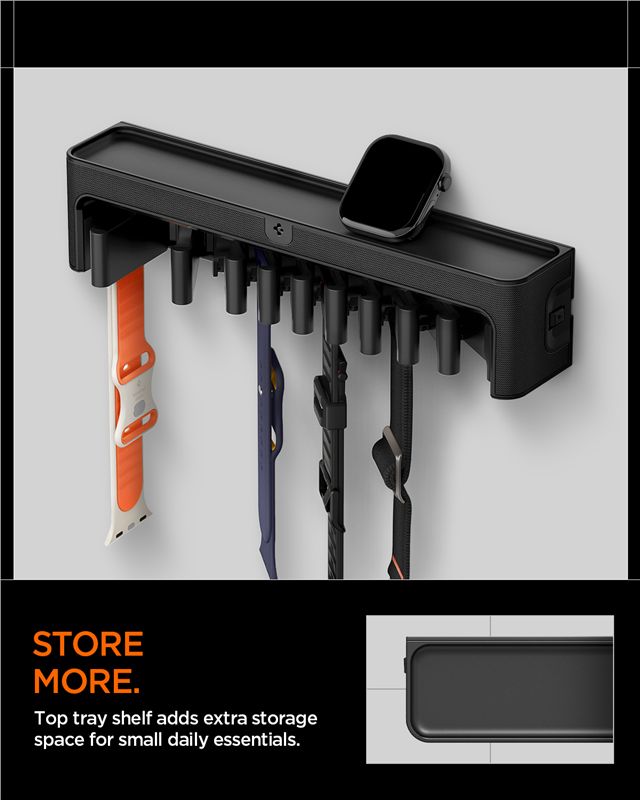 Nástěnný organizér Spigen S341 efektivně soustředí kolekci řemínků pro Apple Watch na jednom místě. Konstrukce z odolného polykarbonátu obsahuje deset háčků pro snadné zavěšení řemínků a praktickou horní poličku pro odložení předmětů každodenní potřeby, čímž uvolňuje místo na pracovní ploše.