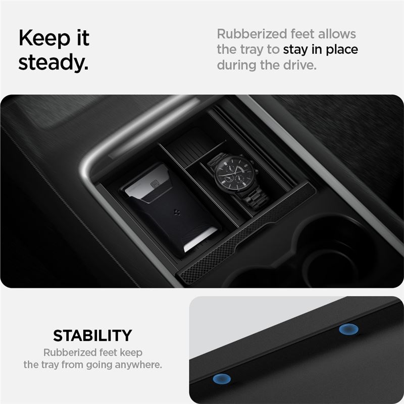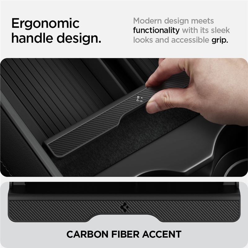 Výsuvný organizér Spigen přehledně člení vnitřní prostor přední konzole vozů Tesla Model 3 a Model Y (2021–současnost). Plynulý posuvný systém dovoluje kdykoliv zakrýt uložené věci nebo rychle zpřístupnit spodní část úložného prostoru.