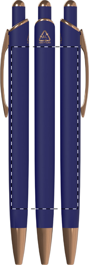 Modré kuličkové pero z recyklovaného hliníku zaujme matným pogumovaným povrchem a doplňky v barvě růžového zlata. Ergonomické provedení zajišťuje pohodlné držení při každodenním psaní v kanceláři i doma.