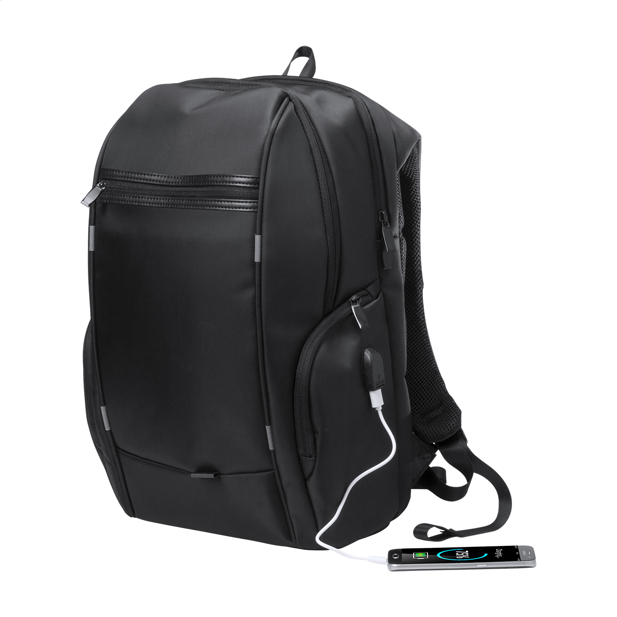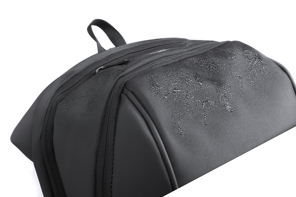Voděodolný nylonový batoh s mnoha přihrádkami na zip, polstrovanou přihrádkou na laptop (až 15 palců), polstrovanými zády a popruhy. S vestavěným USB konektorem pro připojení powerbanky.