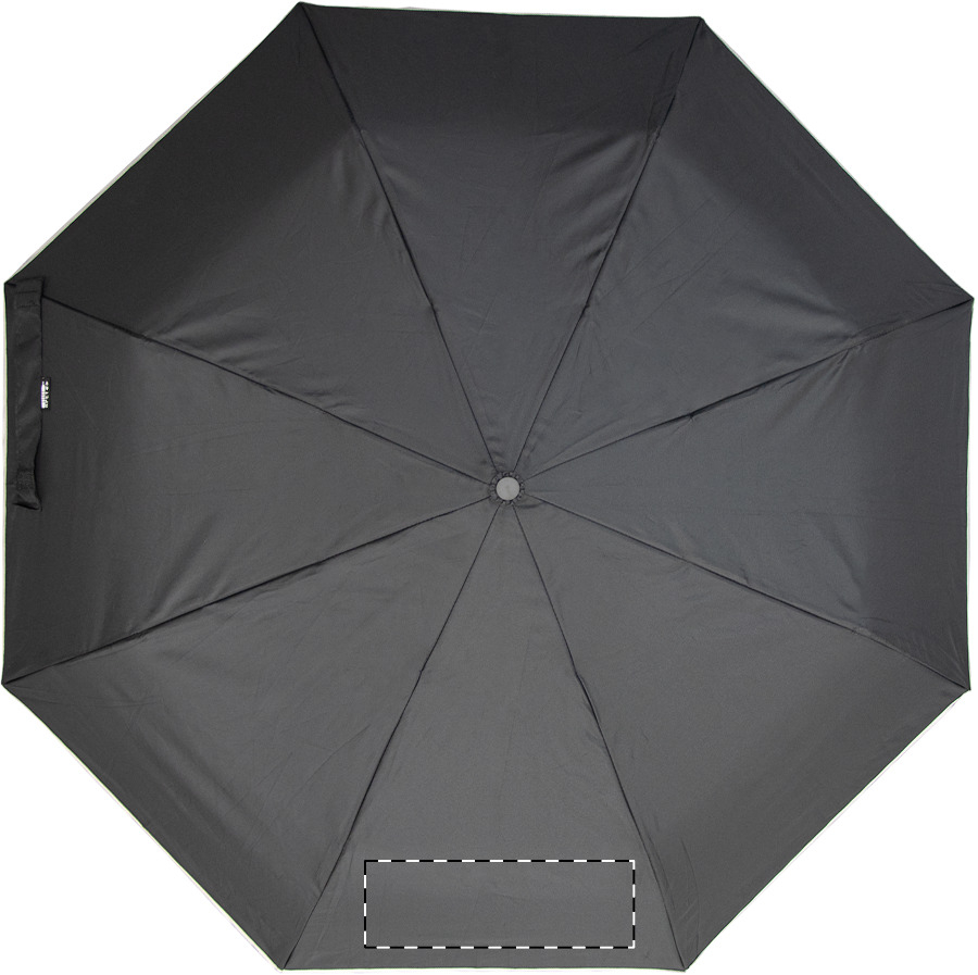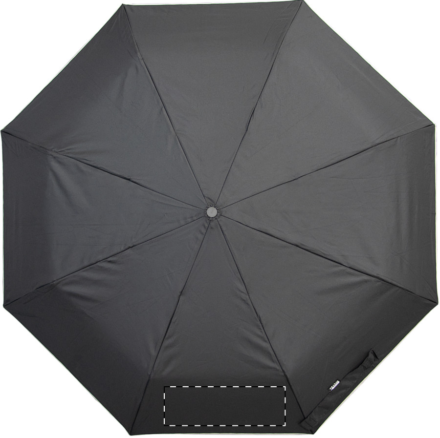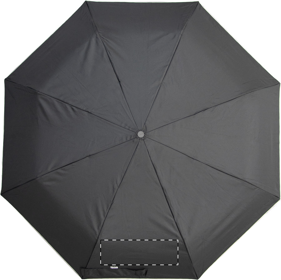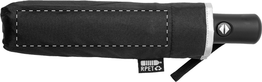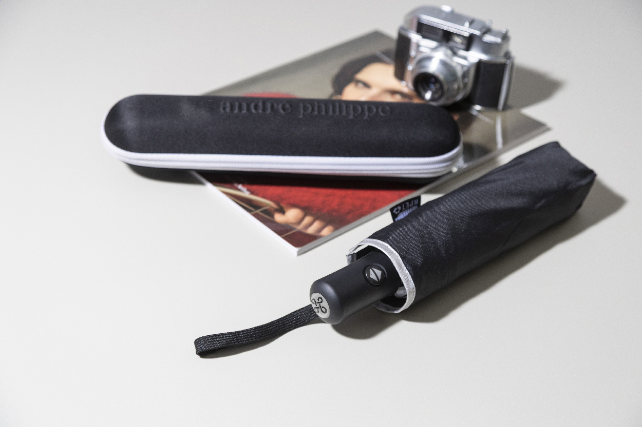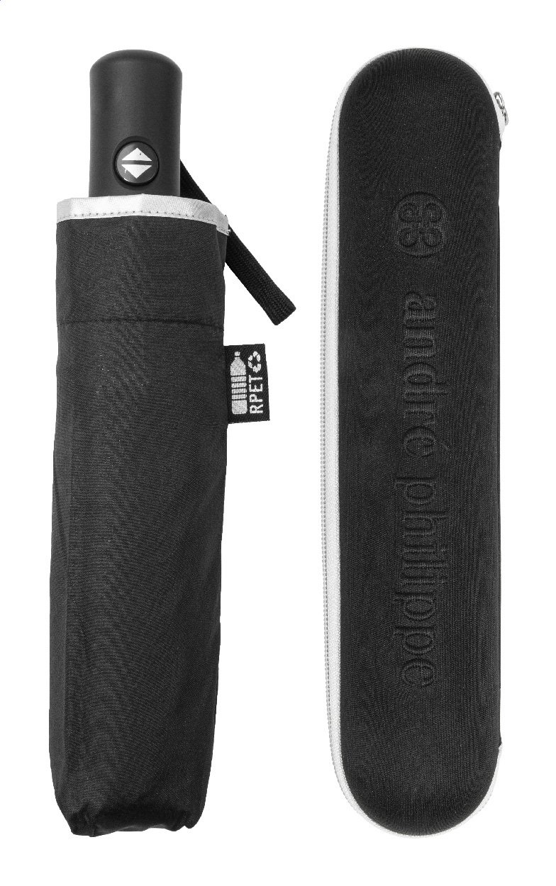Plně automatický (otevírání/zavírání), větruodolný skládací deštník s 8 panely, stříbrné lemování. S kovovým rámem, žebry ze skelných vláken, pogumovanou rukojetí s popruhem na ruku a přepravním pouzdrem. Ponž 190T RPET. S výrazným štítkem RPET. Ve značkovém pevném pouzdře na zip. Výrobek značky André Philippe.