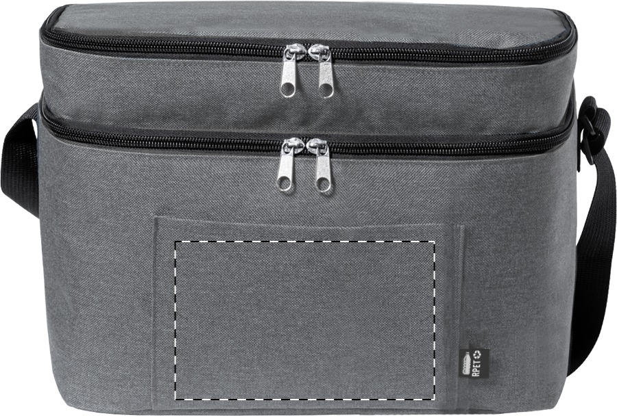 Chladicí taška z 600D RPET polyesteru s PEVA výstelkou, se 2 přihrádkami na zip a nastavitelným ramenním popruhem. S výrazným štítkem RPET.
