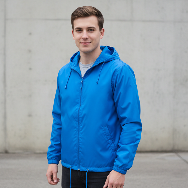 Lehká, potažená polyesterová tkanina. Větruodolný a odpuzující vodu (vodní sloupec 600 mm). Šňůra na lemu. Dvě boční zasouvací kapsy. Kapuce se šňůrkou integrovanou do límce. Elastické zakončení rukávů. Praktický úložný prostor v boční kapse, kterou lze pohodlně nosit kolem pasu pomocí elastického pásku.