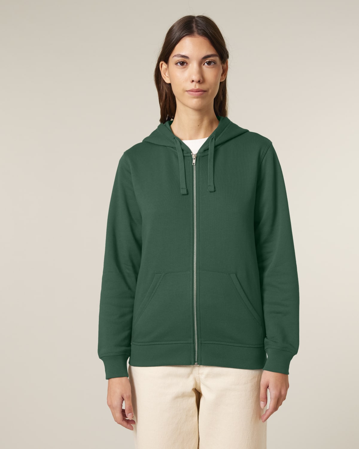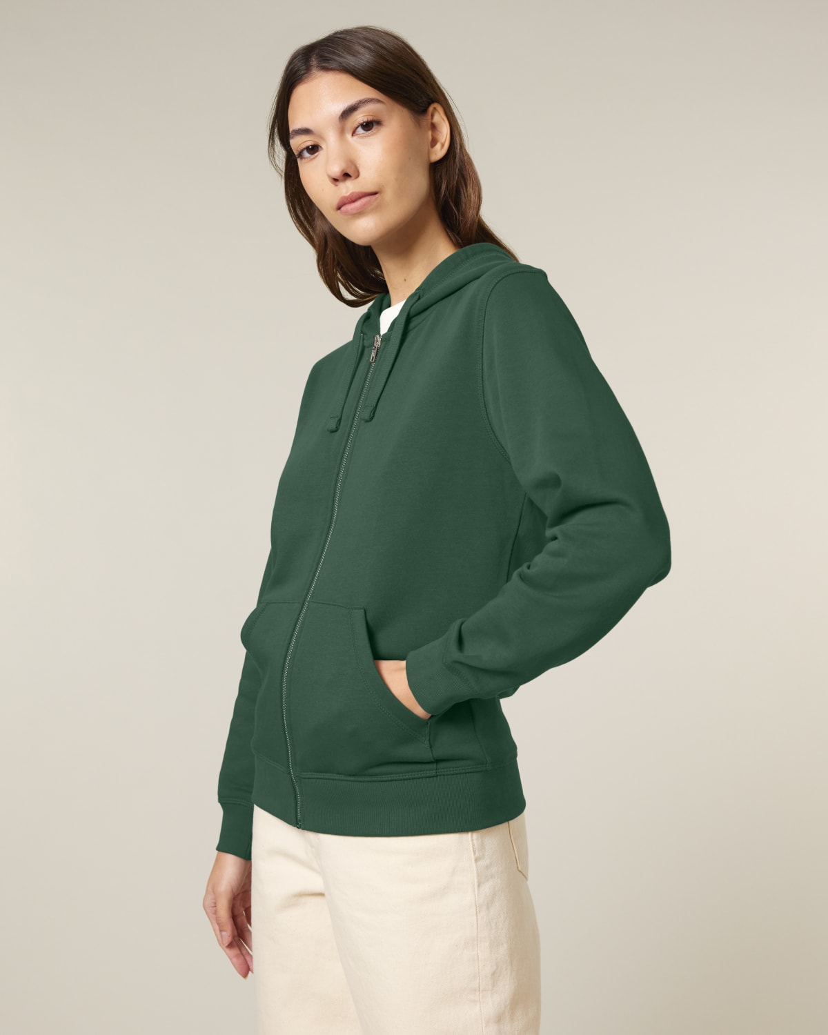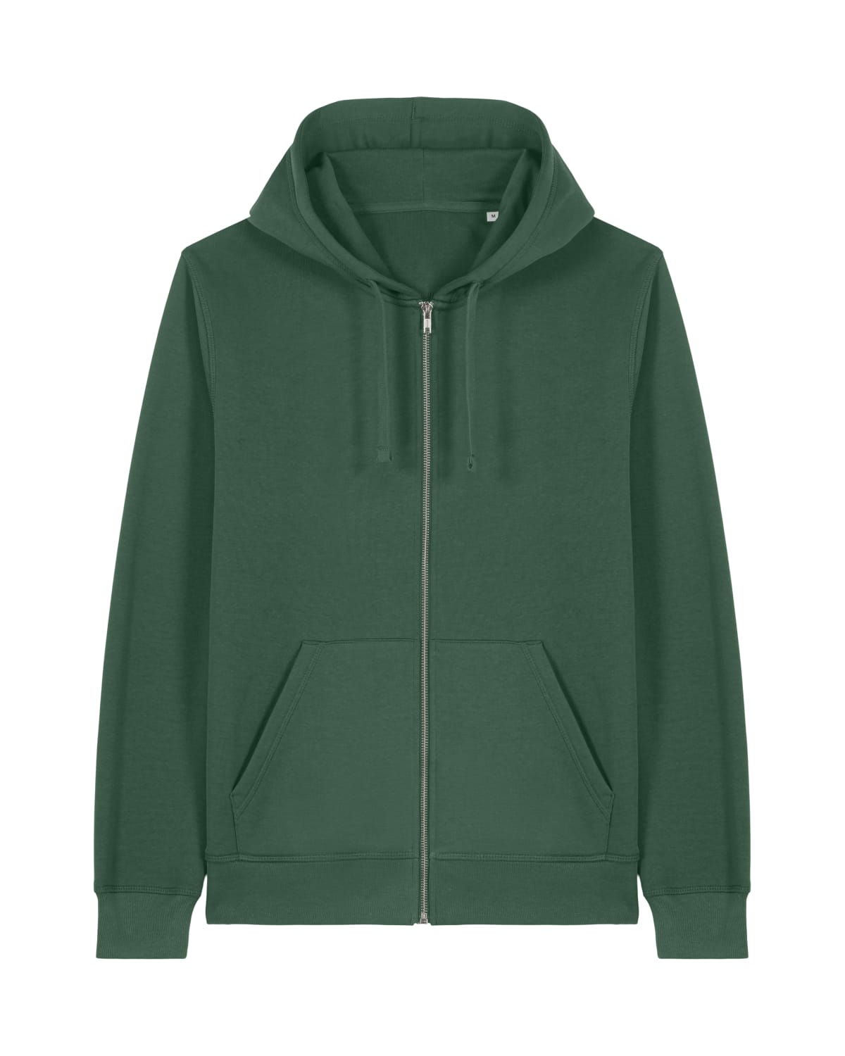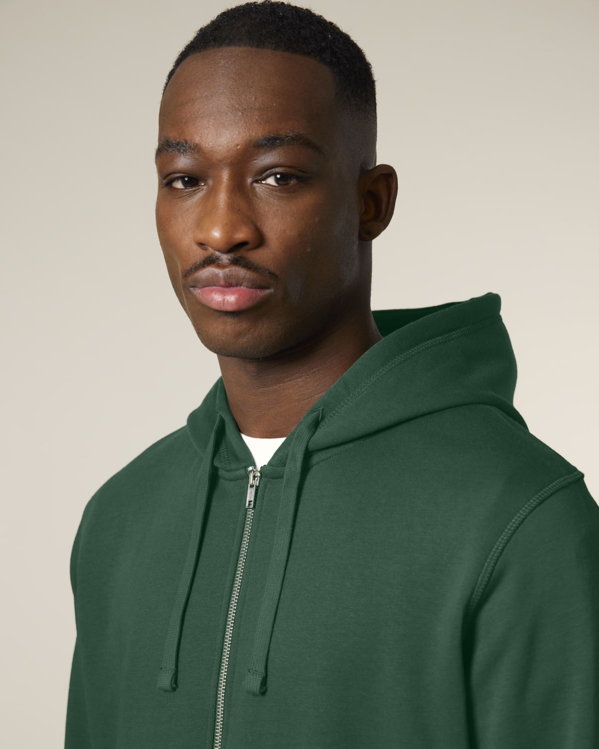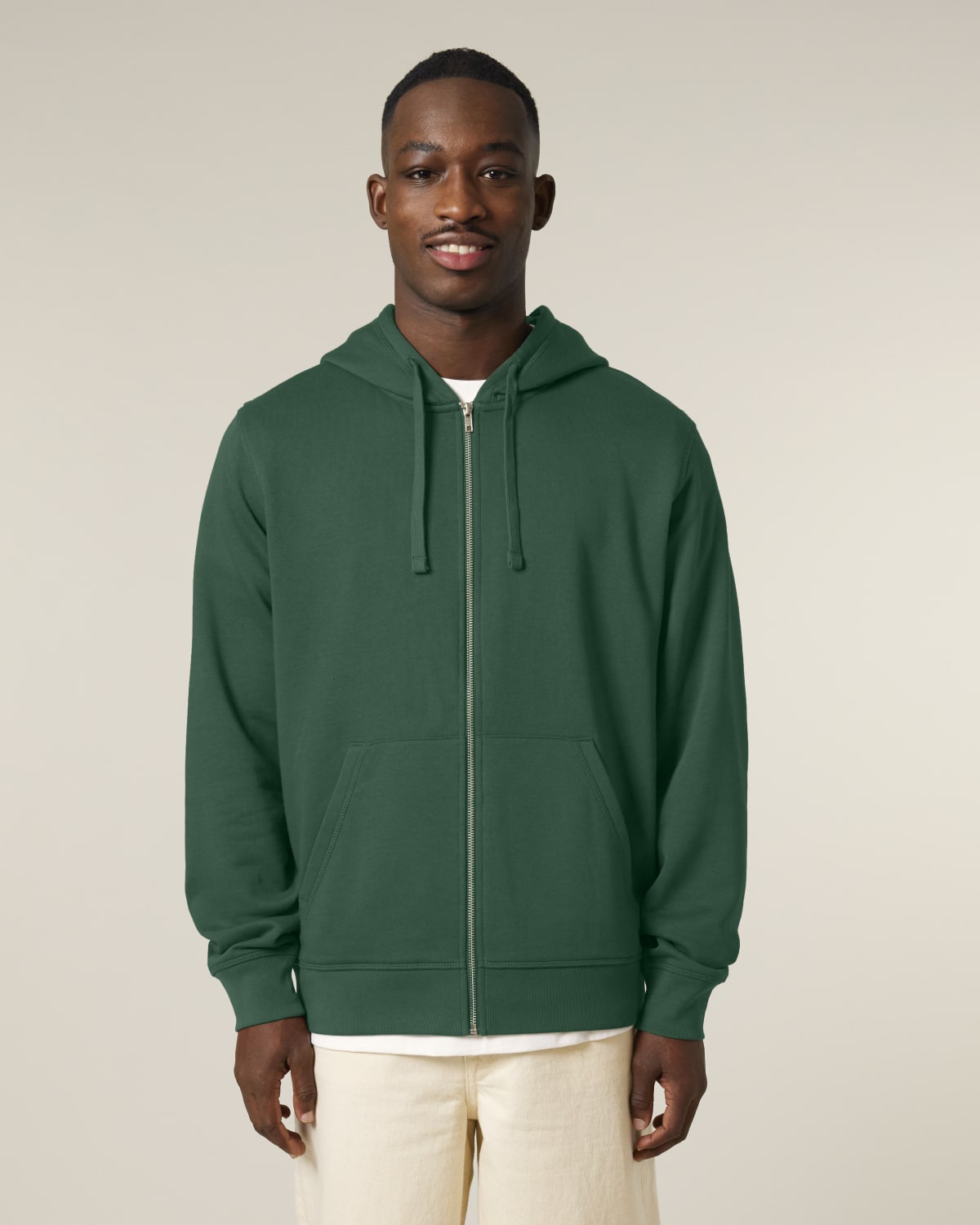 Pánská mikina se zipem a kapucí. Vsazené rukávy. Kapuce má plochou stahovací šňůrku a obšitá očka. 1x1 žebrované lemy rukávů a spodní lem. Klokaní kapsa s plochými stehy. Kovový zip po celé délce mikiny. Zpevňující látka za krkem a u zipu.