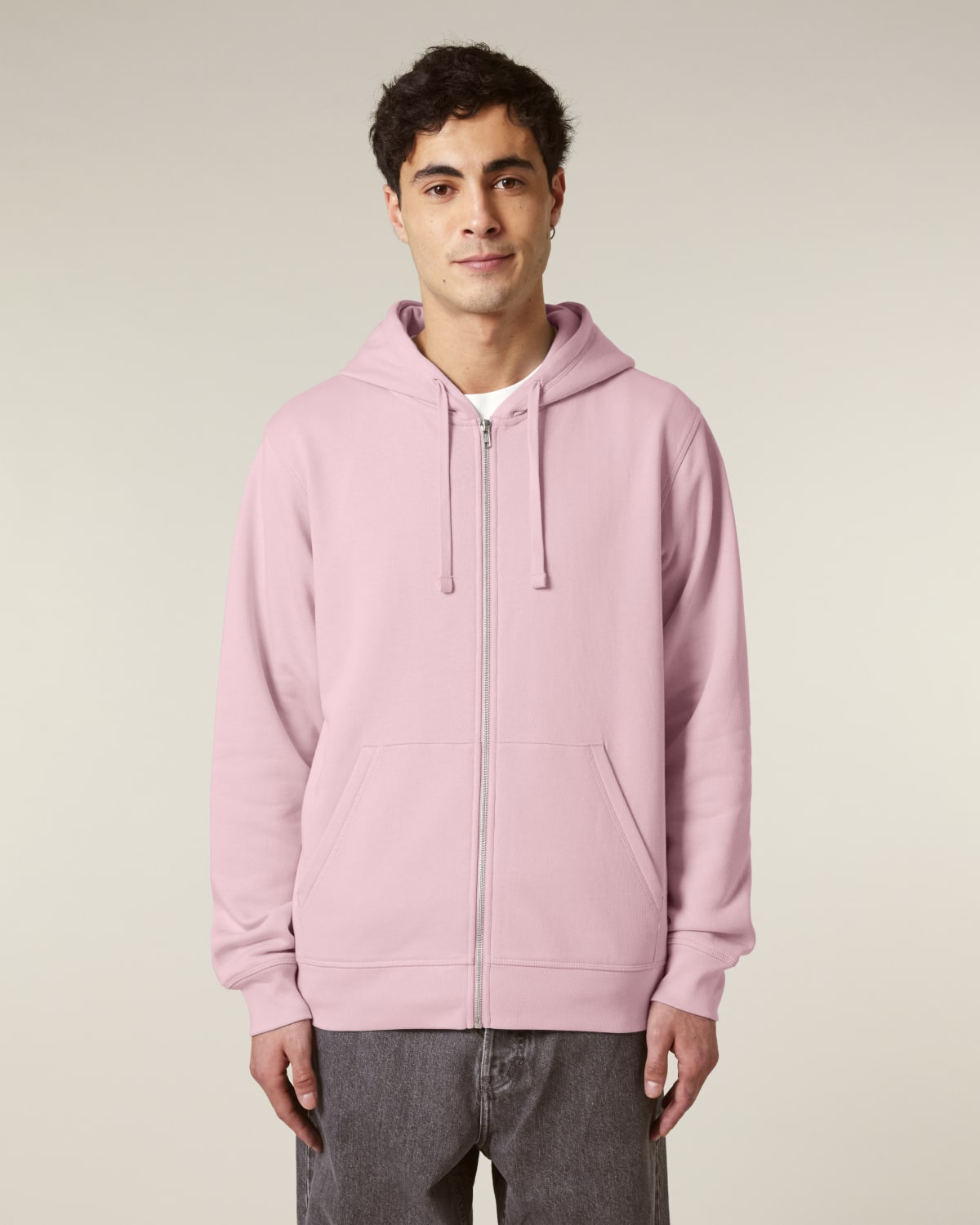 Pánská mikina se zipem a kapucí. Vsazené rukávy. Kapuce má plochou stahovací šňůrku a obšitá očka. 1x1 žebrované lemy rukávů a spodní lem. Klokaní kapsa s plochými stehy. Kovový zip po celé délce mikiny. Zpevňující látka za krkem a u zipu.