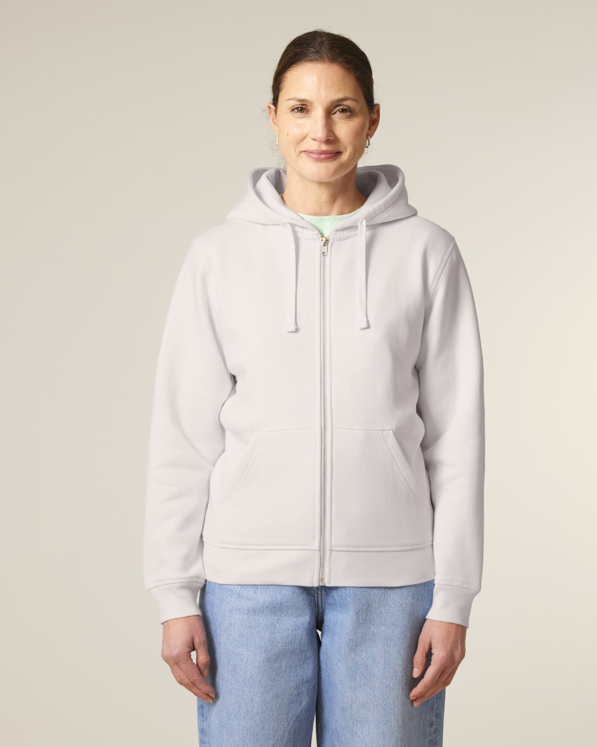 Pánská mikina se zipem a kapucí. Vsazené rukávy. Kapuce má plochou stahovací šňůrku a obšitá očka. 1x1 žebrované lemy rukávů a spodní lem. Klokaní kapsa s plochými stehy. Kovový zip po celé délce mikiny. Zpevňující látka za krkem a u zipu.