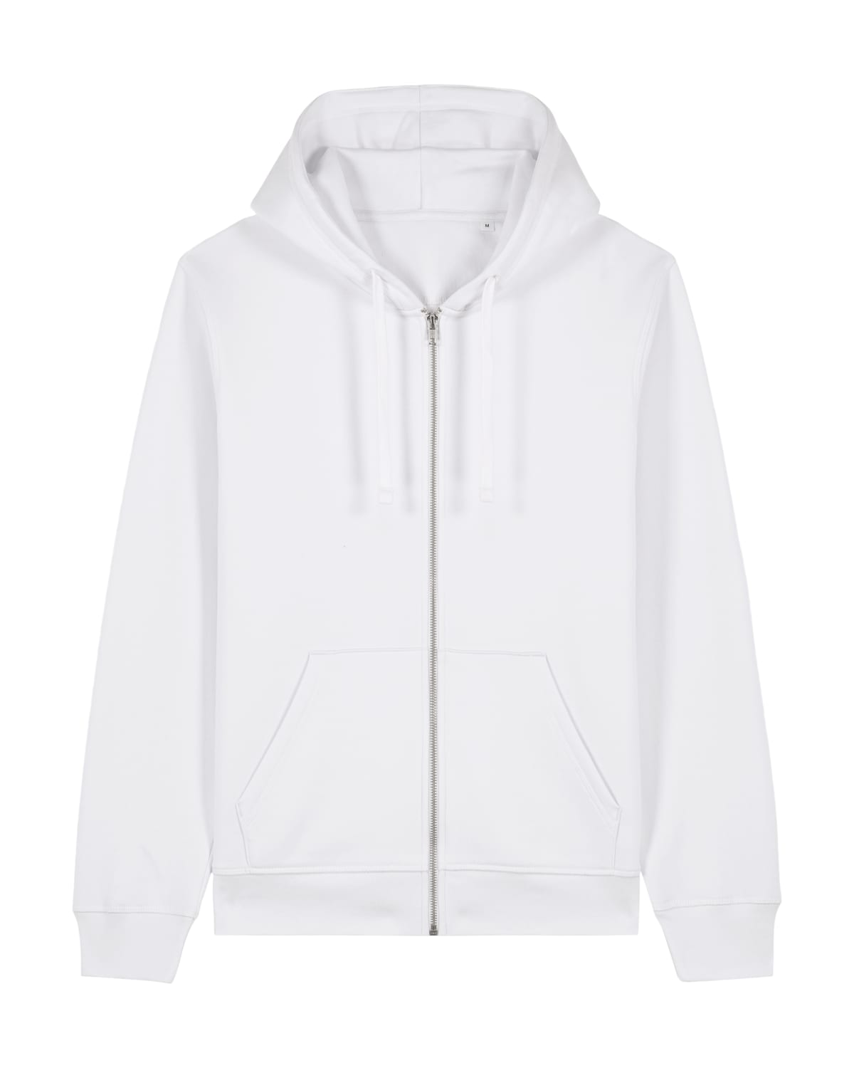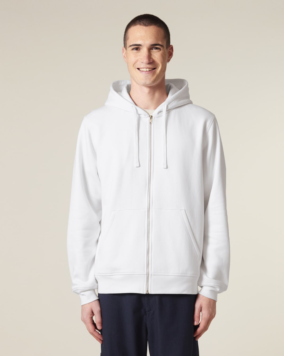 Pánská mikina se zipem a kapucí. Vsazené rukávy. Kapuce má plochou stahovací šňůrku a obšitá očka. 1x1 žebrované lemy rukávů a spodní lem. Klokaní kapsa s plochými stehy. Kovový zip po celé délce mikiny. Zpevňující látka za krkem a u zipu.